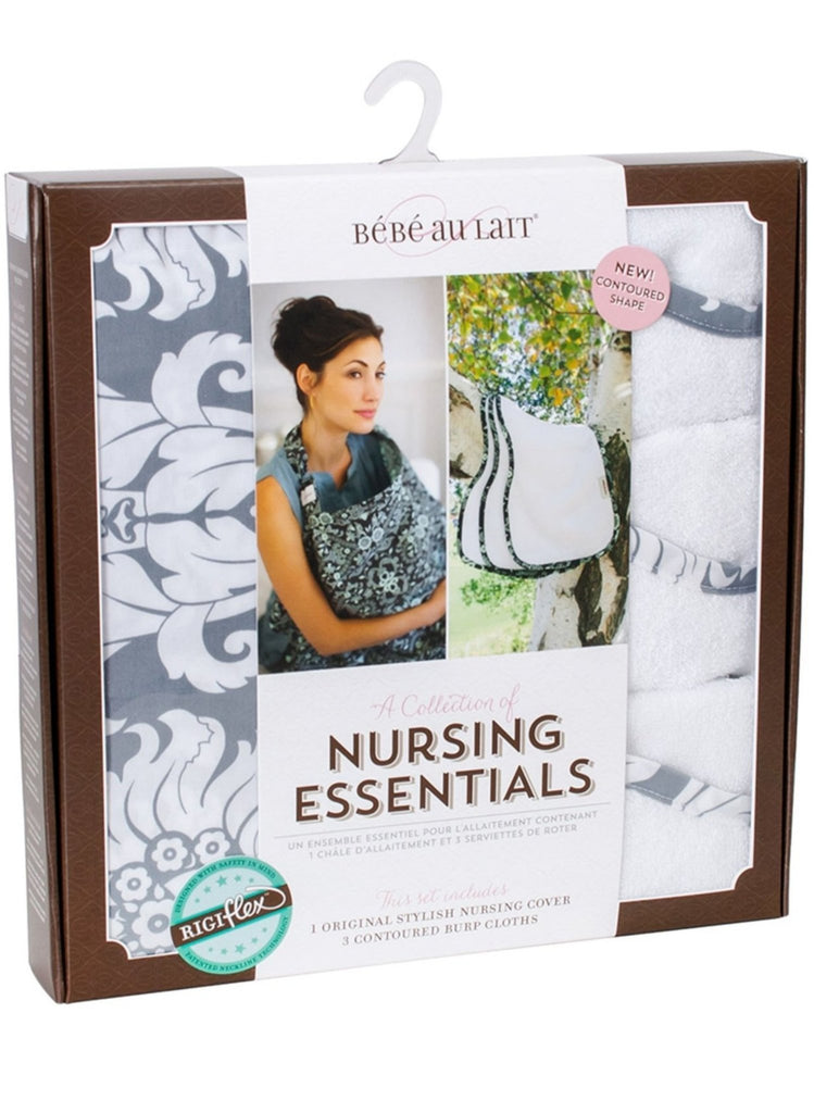 The Bebe au Lait Premium Cotton Nursing Essentials Set contains practical and stylish new-baby basics, including the award-winning Nursing Cover and three matching contoured burp cloths. Bebe au Lait's Premium Cotton Nursing Cover helps maintain privacy and comfort while nursing on the go. This breastfeeding cover has a patented Rig flex open neckline that holds the cover away from mom and baby, which allows them to maintain eye contact and continue the important bond during breastfeeding. The open neckline also ensures proper air flow and allows mom to see that baby is properly latched, encouraging breastfeeding success. The neck strap is secure and adjustable to hold the cover in place, so you can breastfeed with confidence no matter where you are.
