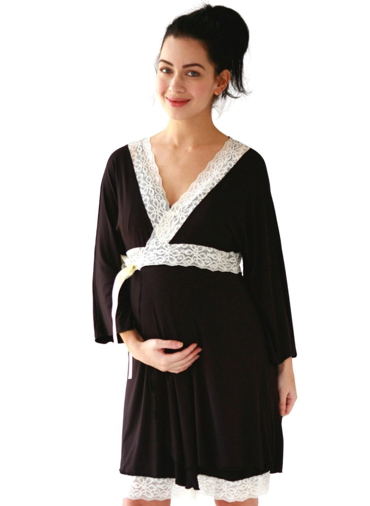 The best selling maternity/nursing silhouette in soft baby jersey trimmed with vintage Lotus lace. Perfect for pregnancy and post-pregnancy nursing comes with a lovely kimono style wrap robe trimmed in luxe vintage Lotus lace. Perfect to cover up in style during pregnancy and after baby.