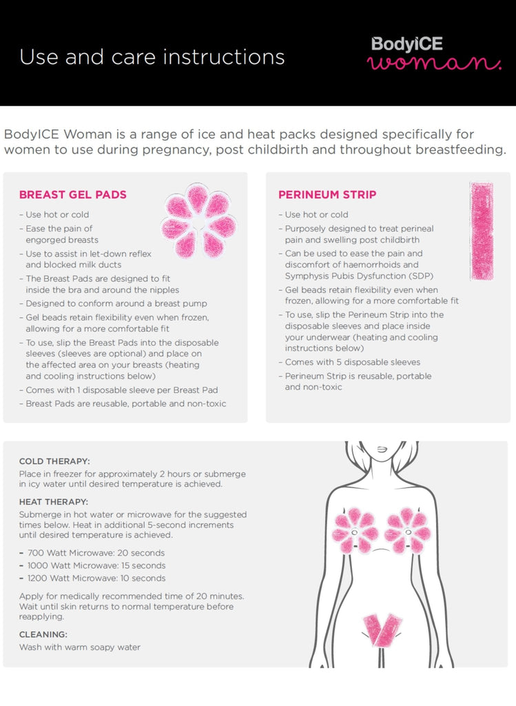 BodyICE® Woman Maternity Care has been carefully designed to help soothe your body during pregnancy, childbirth and breastfeeding. With two comfy breast pads and a dependable perineum strip, BodyICE Woman Maternity Care will provide cooling or warming relief in all your sensitive areas.
