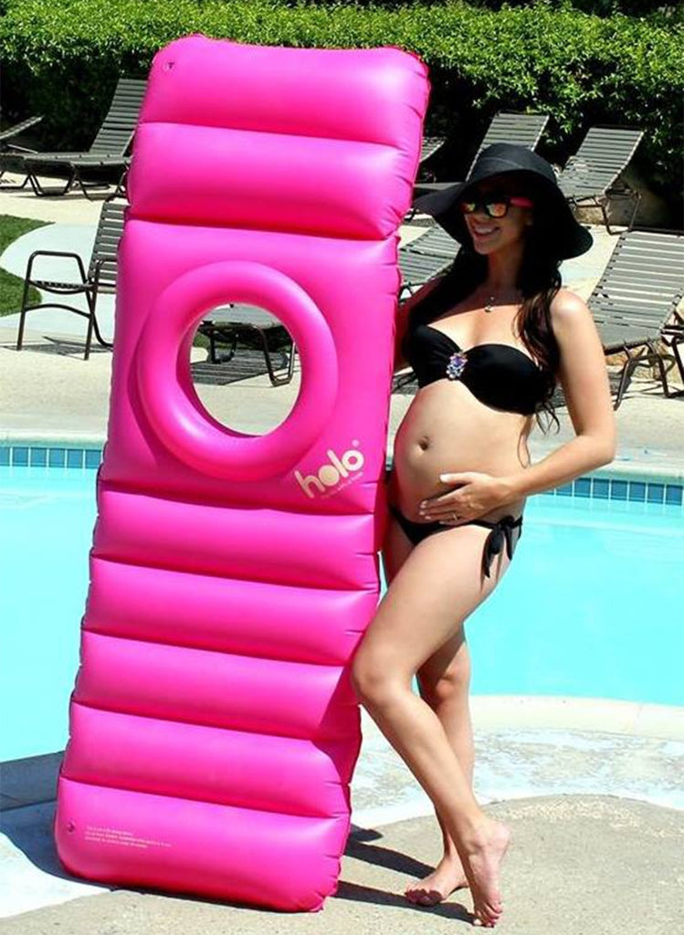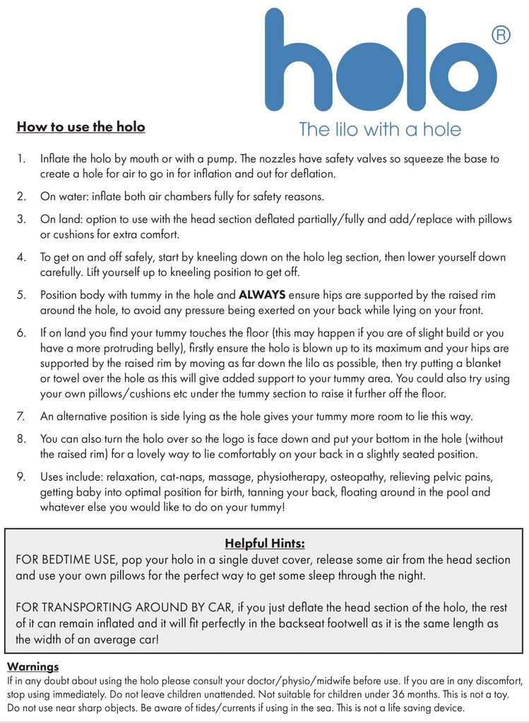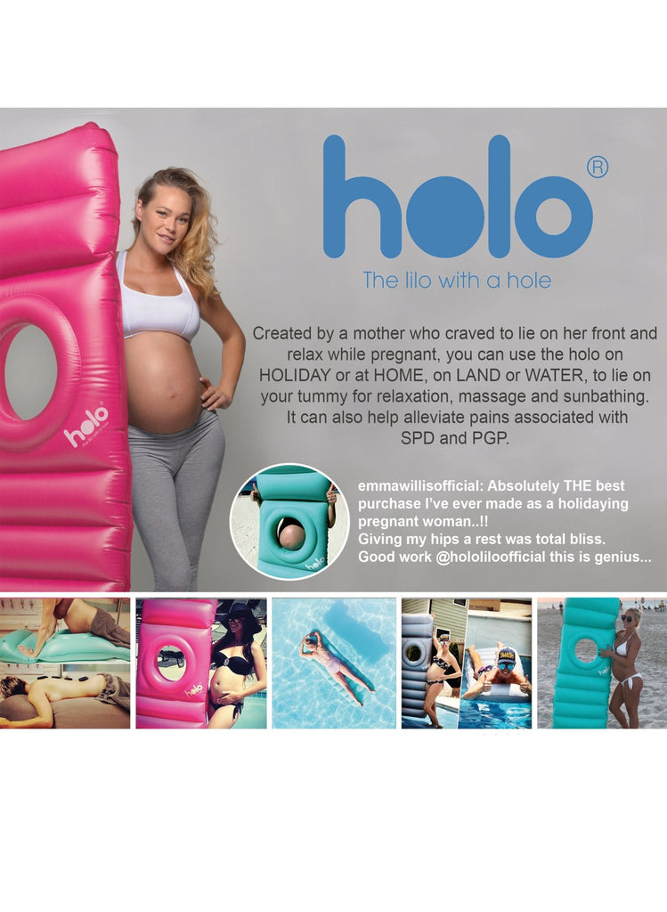 The holo is an inflatable airbed with a hole in the middle, developed for use in pregnancy to enable women to lie on their tummies. Before now, it has always been assumed that once your belly gets too big, front lying is just one of those things that you can’t do, and just had to be accepted as part of pregnancy. Well, now this is not the case and more and more professionals are realising that lying on your tummy is not just an essential part of getting your baby into optimal position for birth, but quite often a way of relieving aches and pains in the pelvis and allowing total relaxation, which in the build up to birth is often hard to achieve. The holo has revolutionised tummy lying in pregnancy. Midwives, osteopaths, yoga teachers, physiotherapists, obstetricians, all who have seen the holo approve of its use and are amazed nothing like this has been developed before.