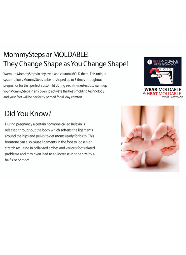 Your foot shape will change slightly throughout your pregnancy. Mommy Steps are designed to change with you! Incorporating the very latest in molding technology, as your pregnancy evolves you can re-mold your insoles up to 3 times for that perfect custom fit!