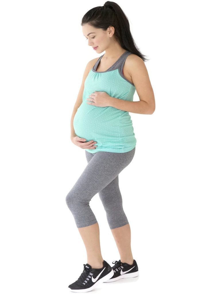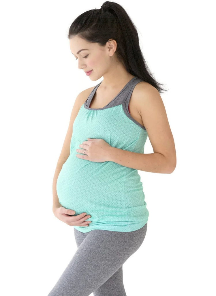 This innovative layered nursing tank features a built-in bra with drop down straps and pull aside nursing access.The supportive bra is made of comfy, moisture wicking fabric and the loose fitting outer layer attaches to a flattering hip band.