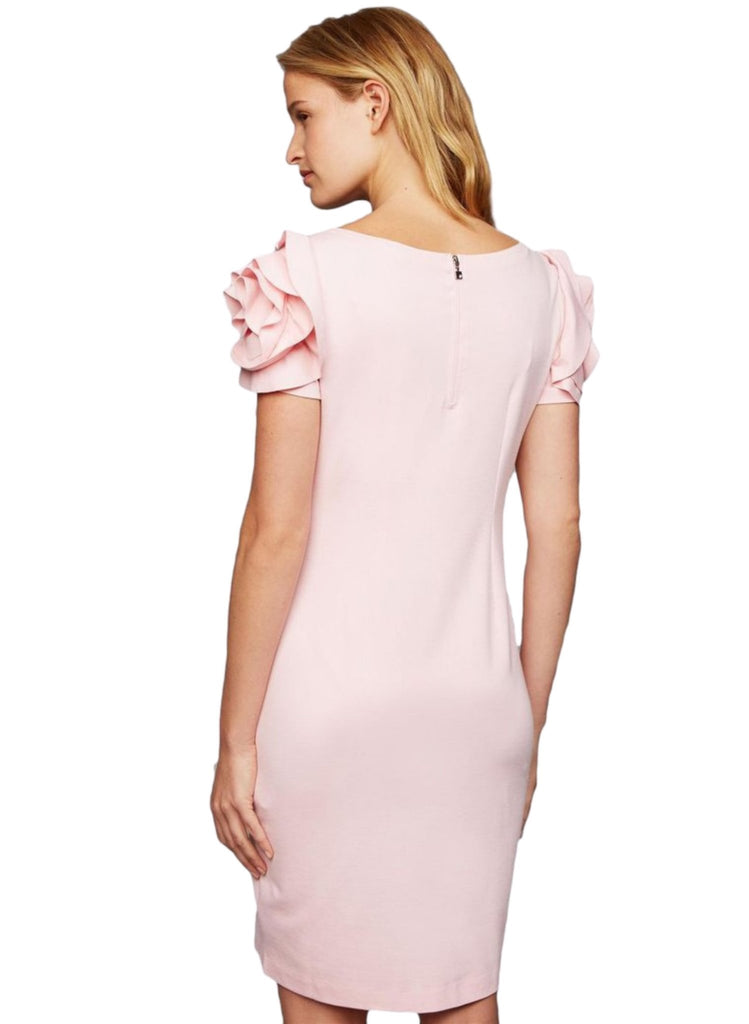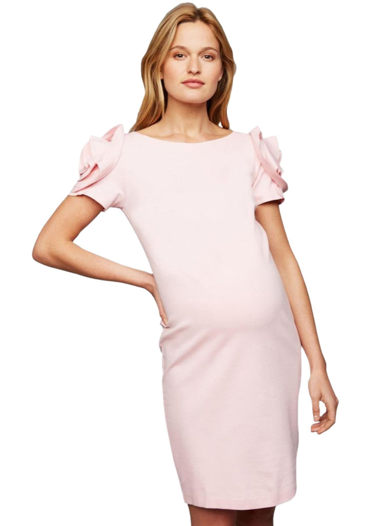Knee length Ponte maternity dress with detailed rose sleeves. Strawberry color, boat neck and zipper detail on back. The stretchy and soft fabric adapts perfectly to the growing bump.