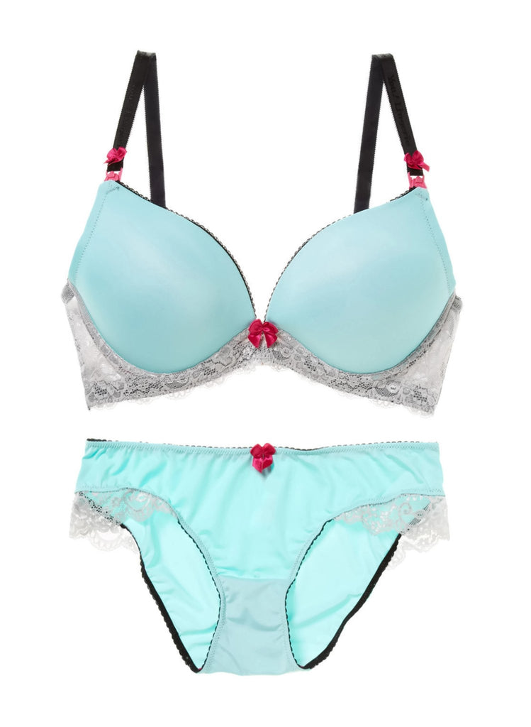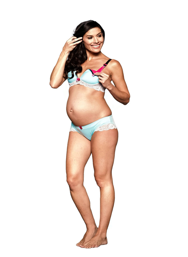 Fall in love with Anastasia! Beautifully constructed maternity and nursing bras feature full molded misty blue cups, glacier gray shimmer lace bands,embellished with the brand's signature splash of hot pink color throughout cup lining, nursing clips, and decorative bows. This gorgeous t-shirt nursing bra provides both function and everyday comfort. Lined with our signature hot pink 100% cotton for breathable comfort.