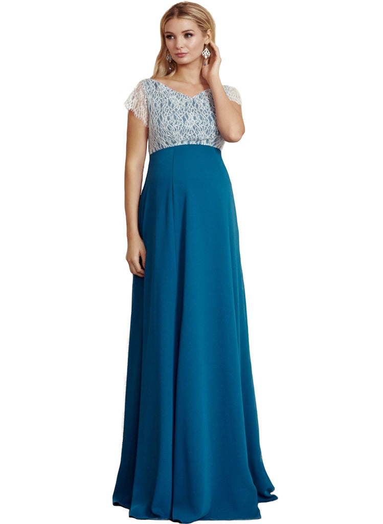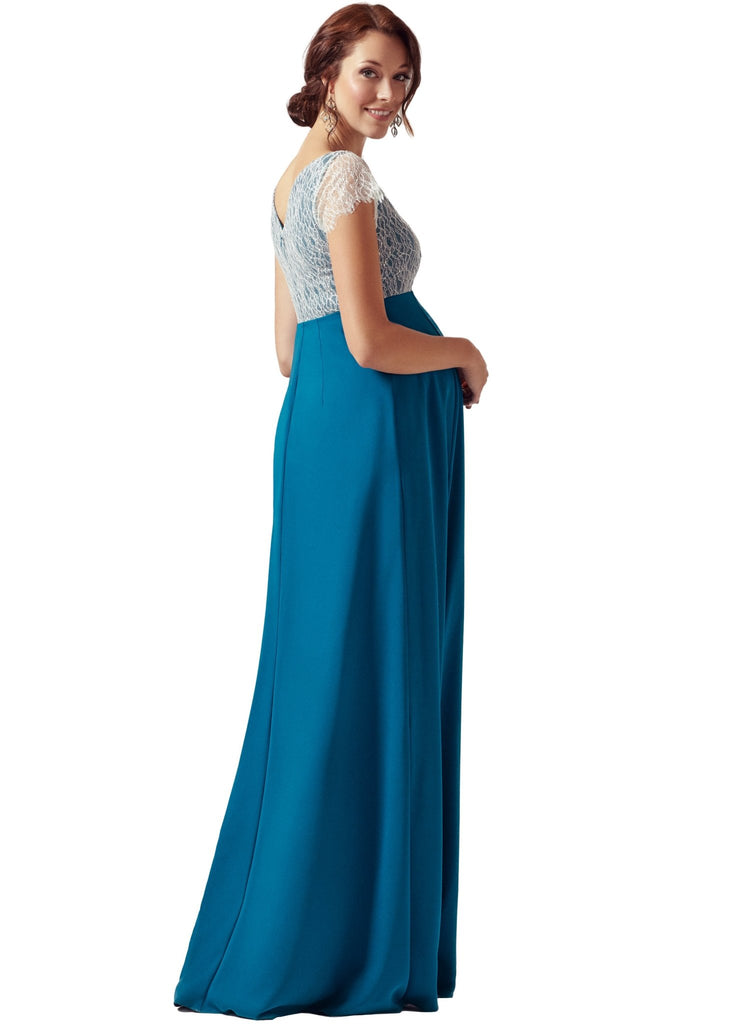 Our Eleanor full-length blue-green maternity gown is a magical dress for any occasion. From the luxurious lace bodice in pale aqua tones to the dramatic draping panelled skirt with concealed back zip in Kingfisher blue, it is a truly exquisite dress to wear.