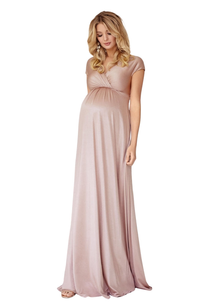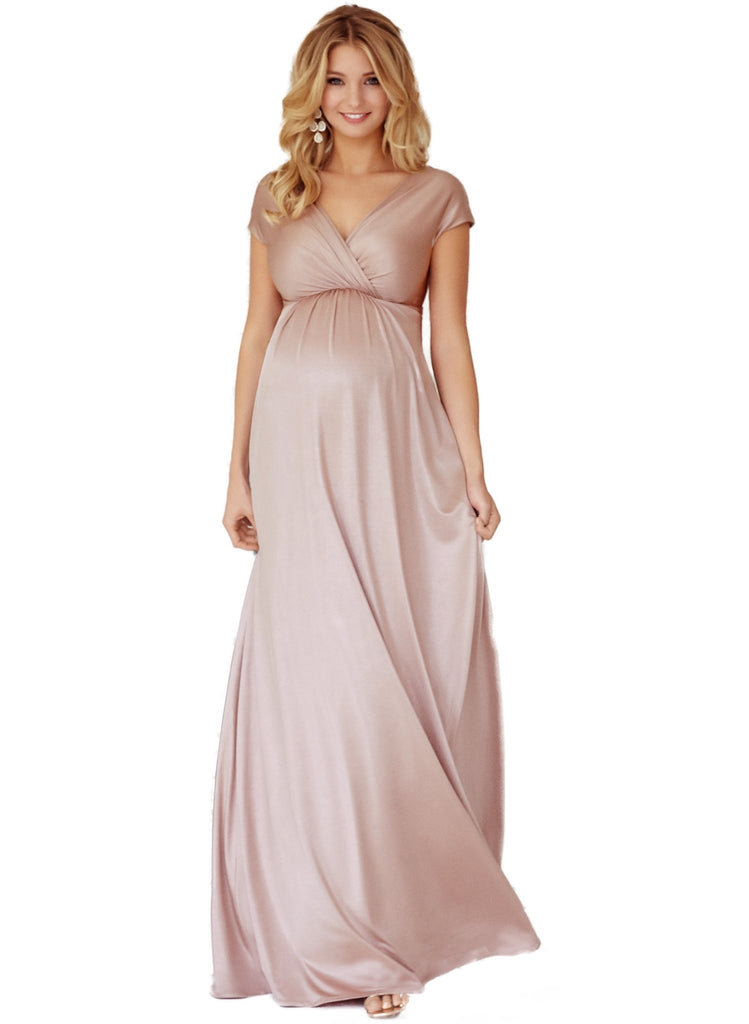 Shimmering French jersey fabric drapes effortlessly over your pregnancy curves, cascading away from the bust in swathes of silken fabric. The flattering crossover neckline extends out to the shoulders where they can be worn on or off to exude bygone glamour.