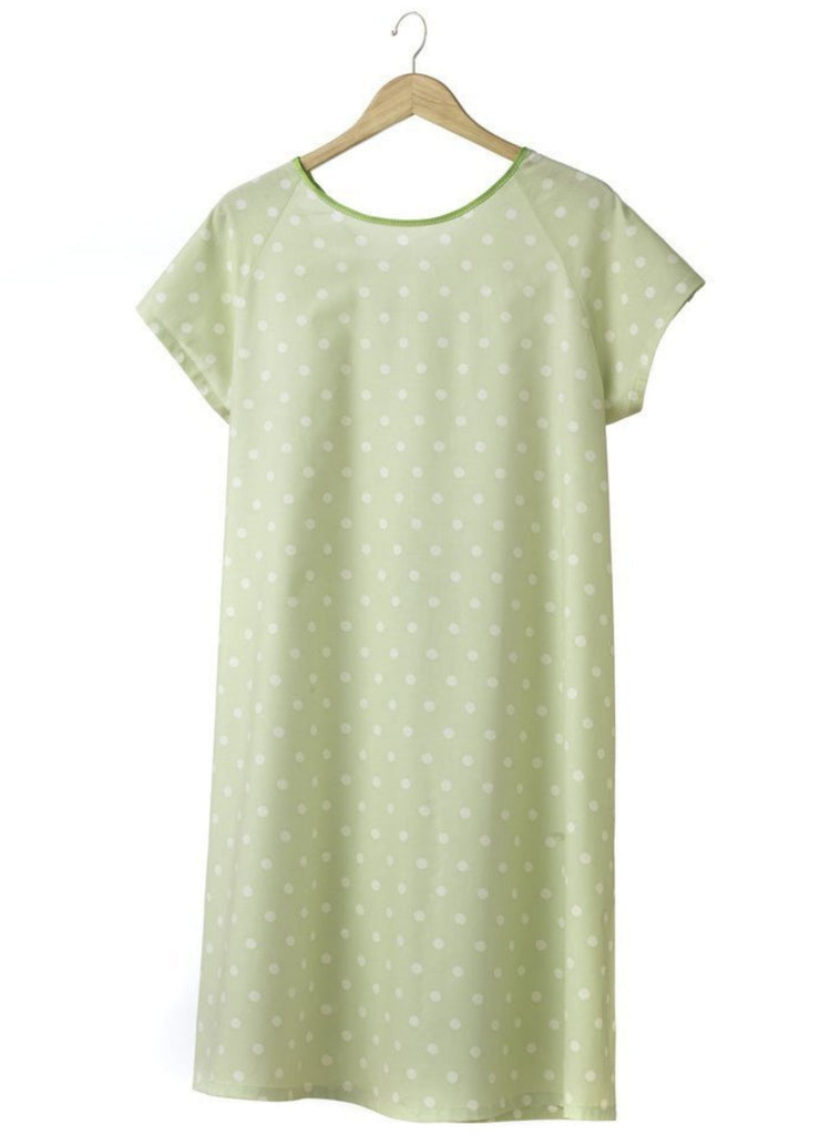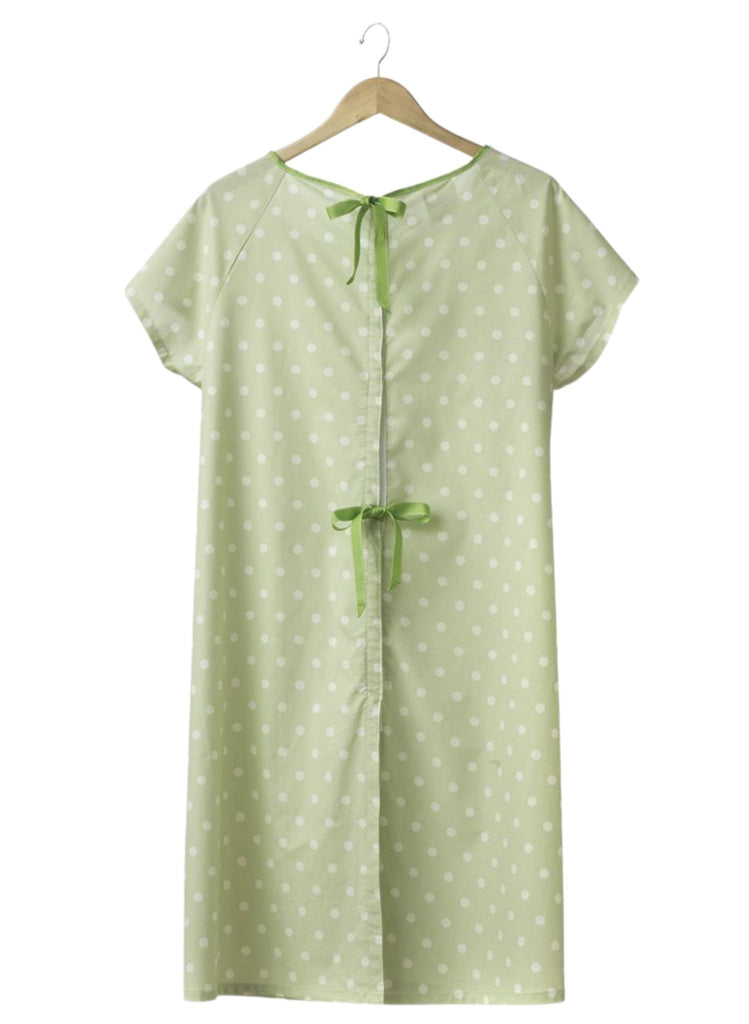 A 100% cotton gown in beautiful light green and white polka dot fabric, trimmed with lime green grosgrain ribbon around the neckline and with decorative ties along the snap down back. Each shoulder snaps down completely for ease of medical access and breastfeeding for nursing mothers.