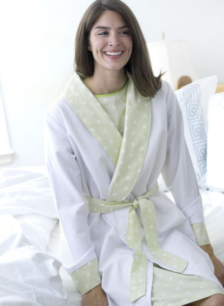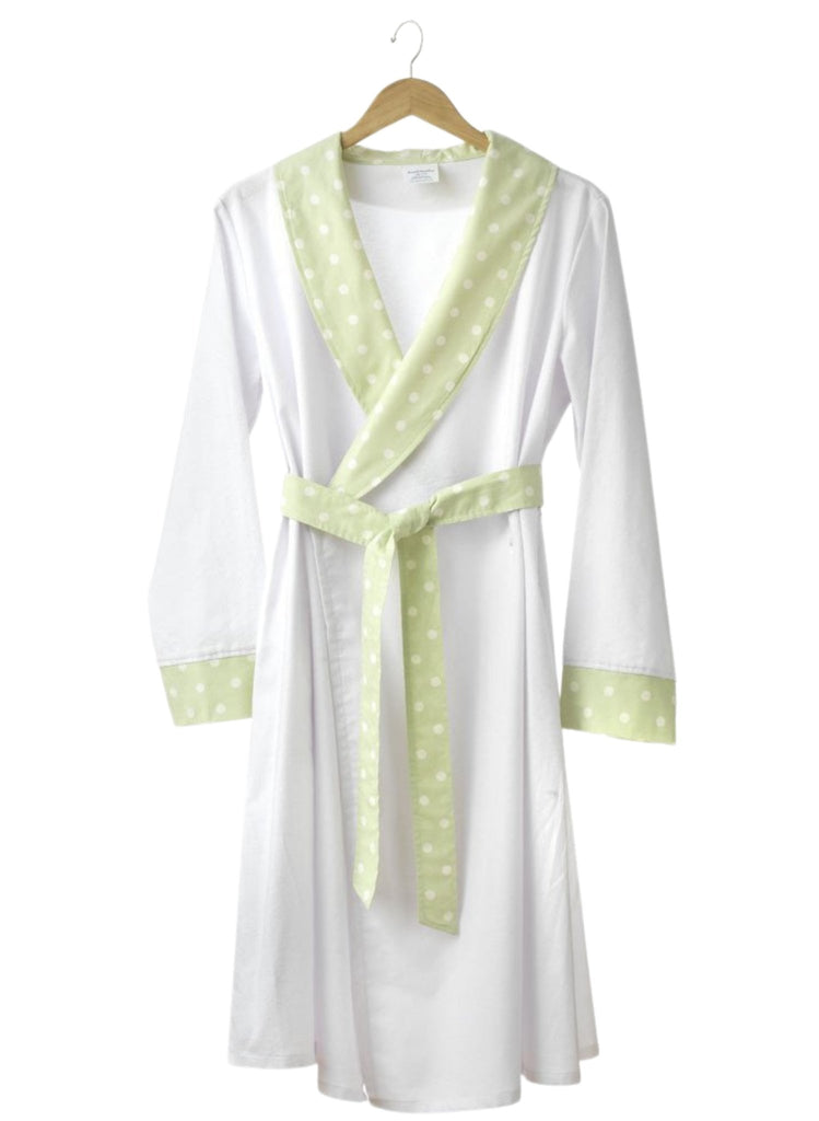 A lightweight, supersoft, 100% cotton white flannel robe trimmed with a beautiful light green and white polka dot fabric on the shawl collar, fold up cuffs, and belt tie.