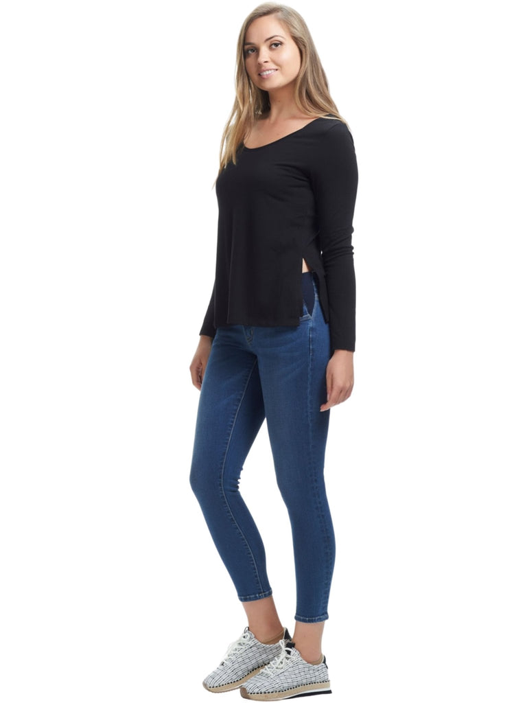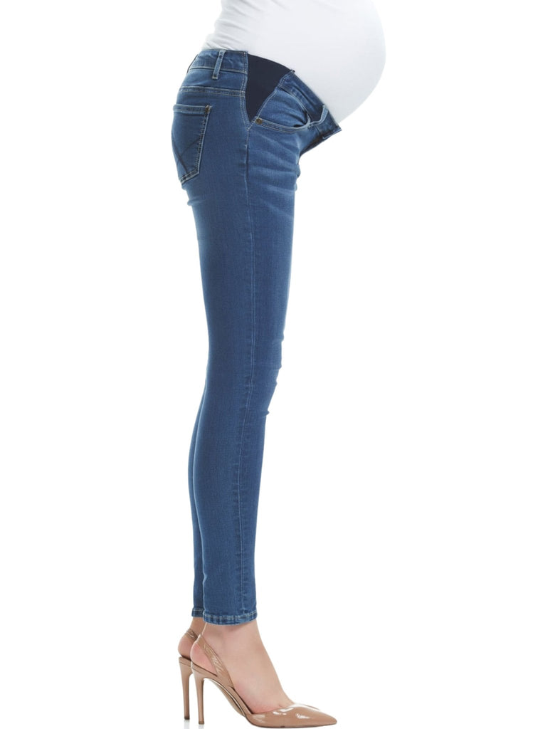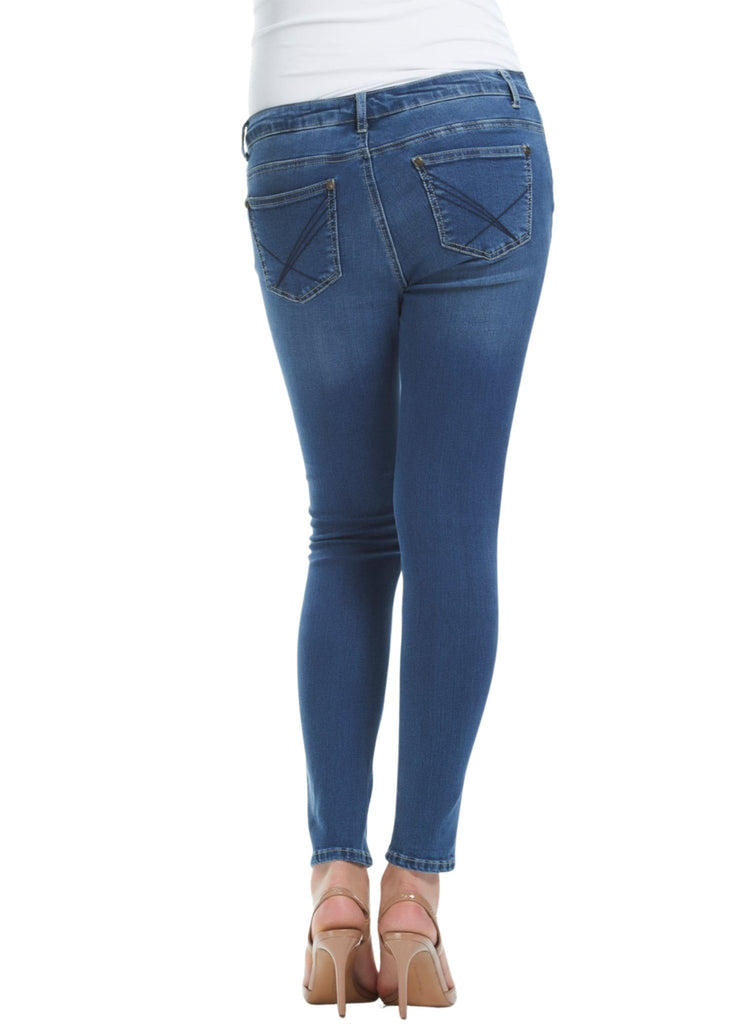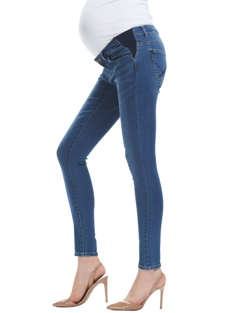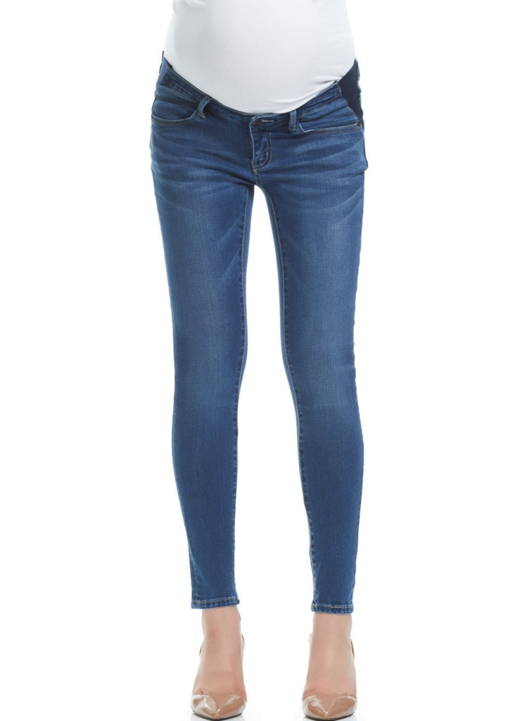 The Esme Skinny Distressed Maternity Denim is our new premium skinny denim. Made in a mid-weight stretch cotton denim that is soft and comfortable. Featuring a low front waist that scoops below the bump and elastic inserts at the side seam to allow the jeans to grow with you this pregnancy. With a slightly cropped length, and knee rip details, these maternity jeans are perfect for casual day dressing but also look fantastic when dressed up with a special blouse and heels.