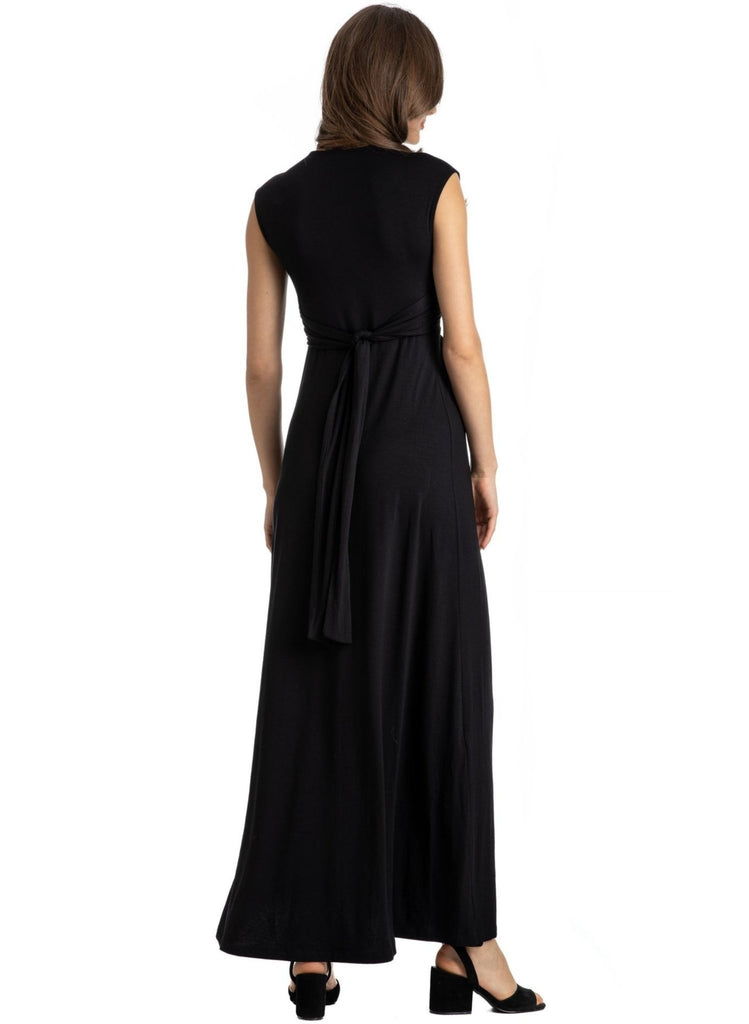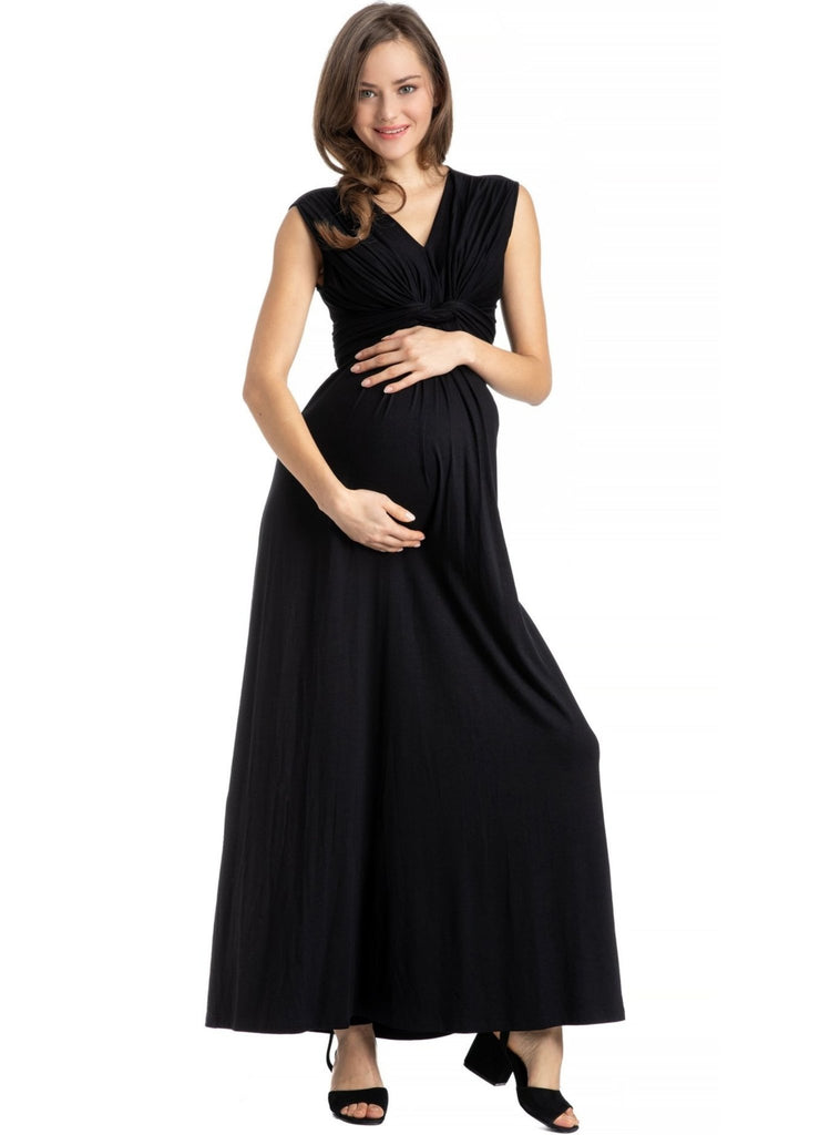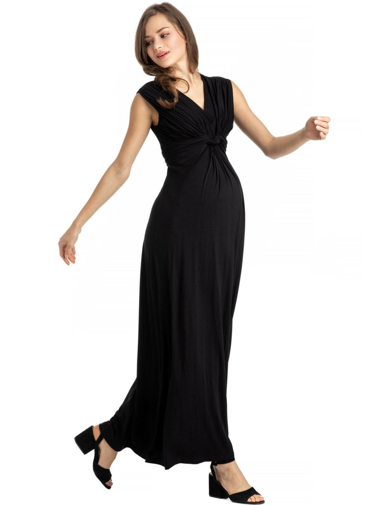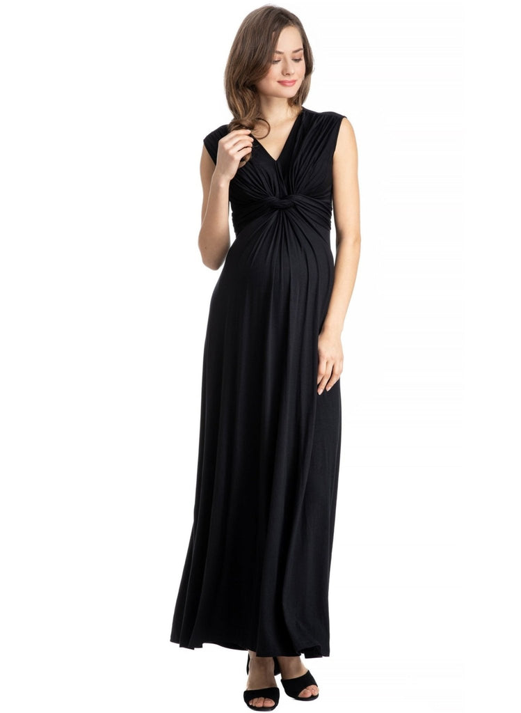 Stylish knot front maternity maxi dress with pleat details on shoulders. Made in soft stretchy bump-friendly jersey, with V-neck and waistline tie detail. With nursing access! Perfect for pregnancy and beyond.