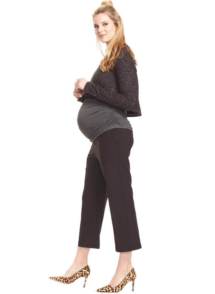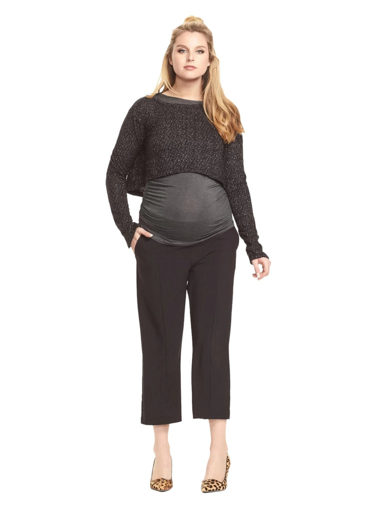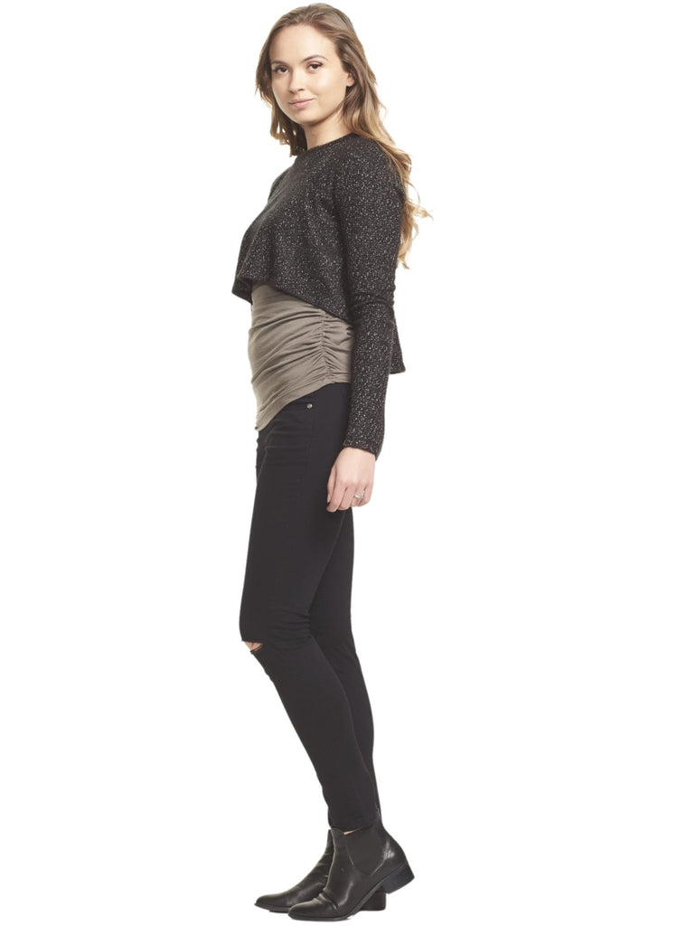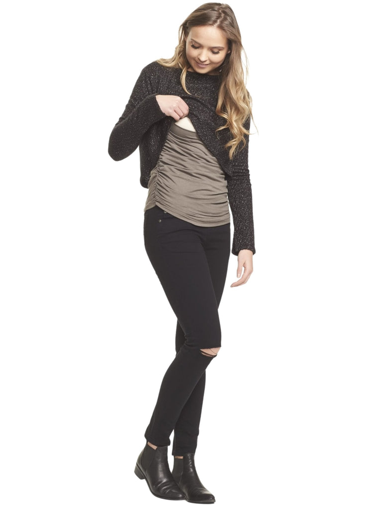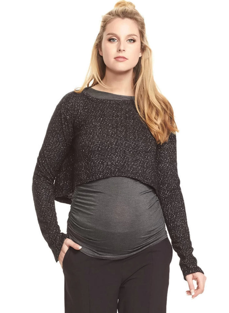 The Daria Crop Knit has a lovely gold lurex spun through the fiber to add a little sparke to your maternity wardrobe! With it's cropped front, the Daria knit is perfect for pairing with our feeding styles post-pregnancy. Underneath top is not included. Layer it over our Honor Feeding Top for added warmth while maintaining easy feeding access!