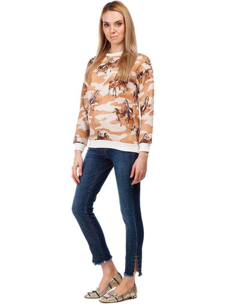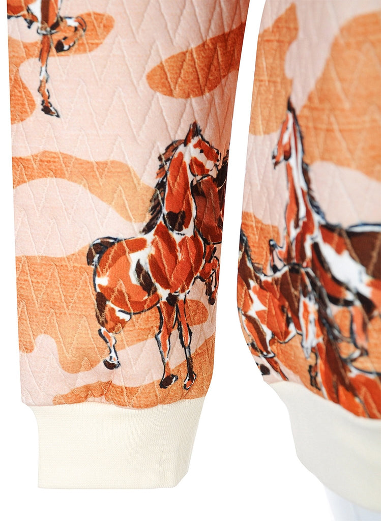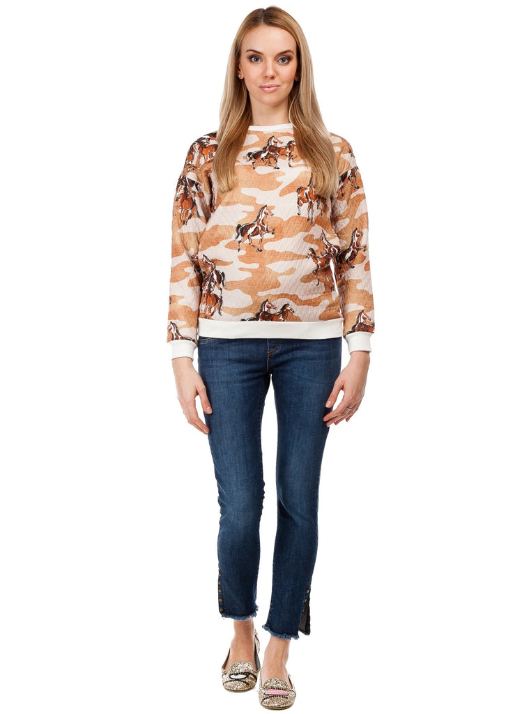 Horse printed maternity loose jumper with matelassè effect. Long sleeve and crew neck. Comfortable and relaxed fit which makes it ideal for all stages of pregnancy.