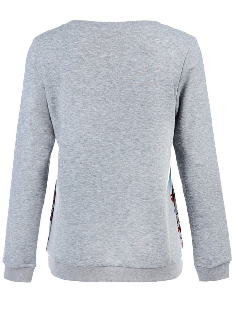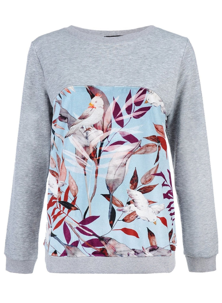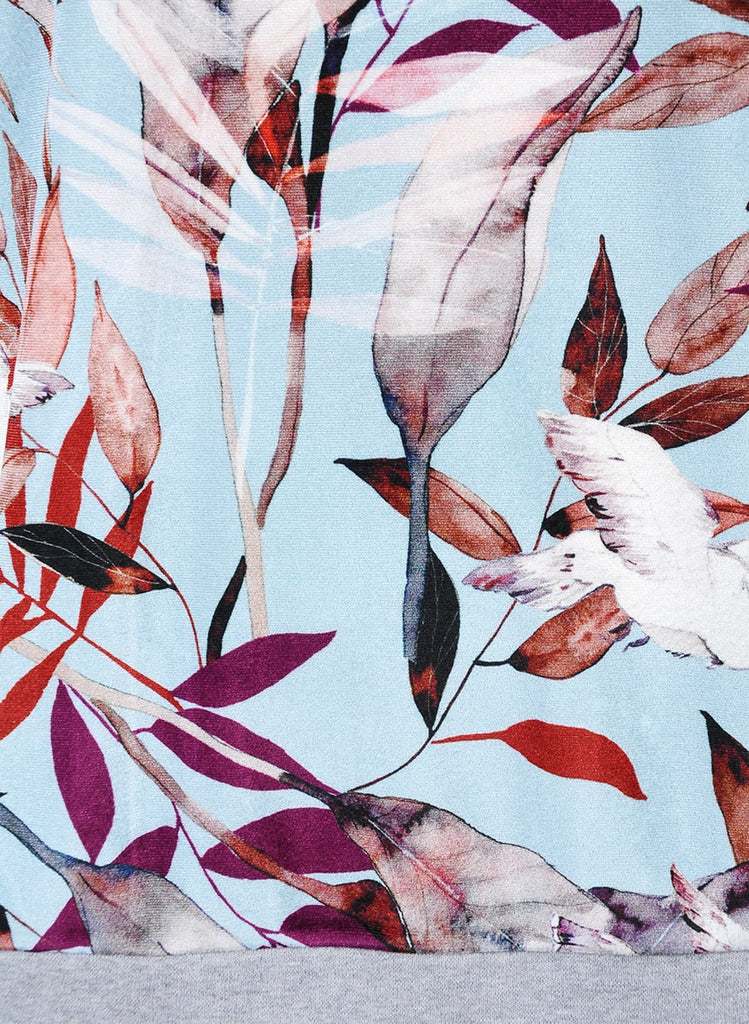 Bird printed nursing shirt with long sleeve and crew neck. Made in velvet with blue novelty fabric in the front. Perfect for before, during and after pregnancy.