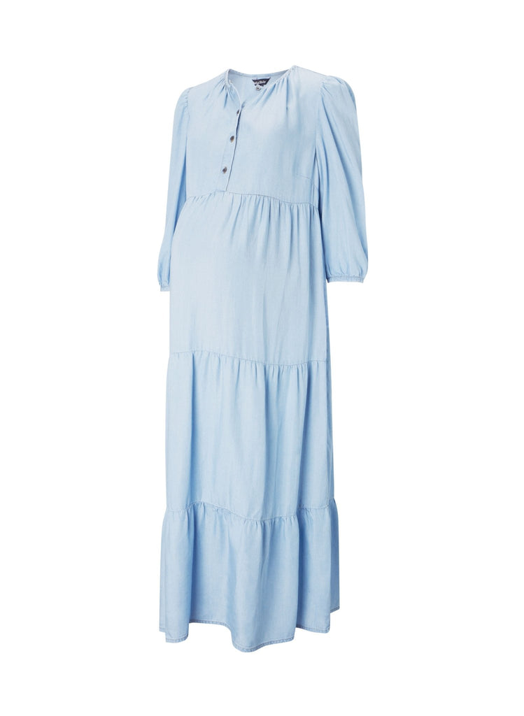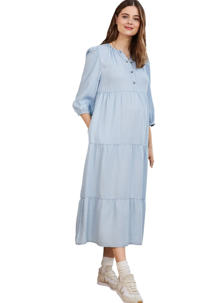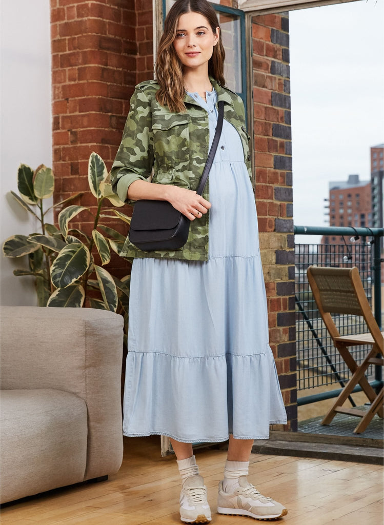 Raffa taps into the prairie trend with its tiered maxi skirt and pretty gathering around the shoulders and neckline. Crafted from eco-friendly Tencel chambray, it is supremely soft and skims the body (and bump!) for the most flattering fit. A button-down neckline and relaxed sleeves make it an off-duty winner - style it with the Drake Organic utility Jacket from our sister brand Baukjen.