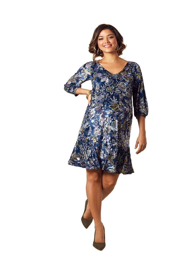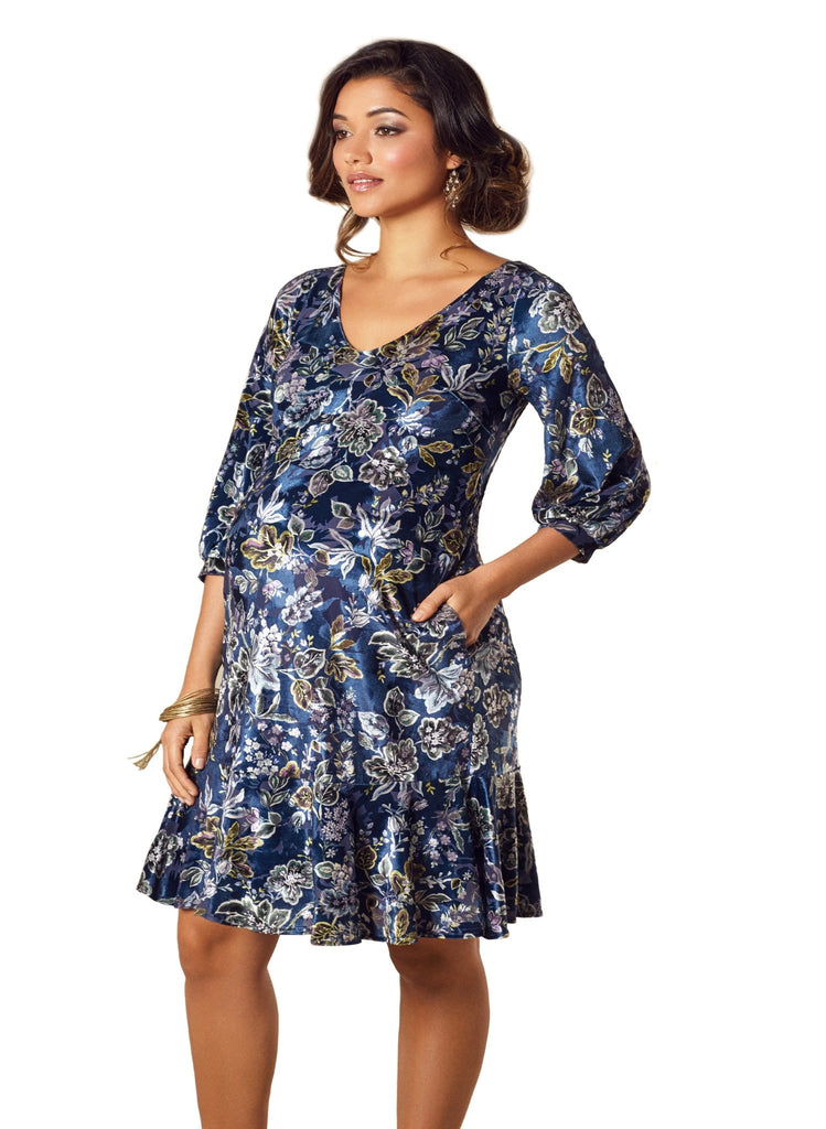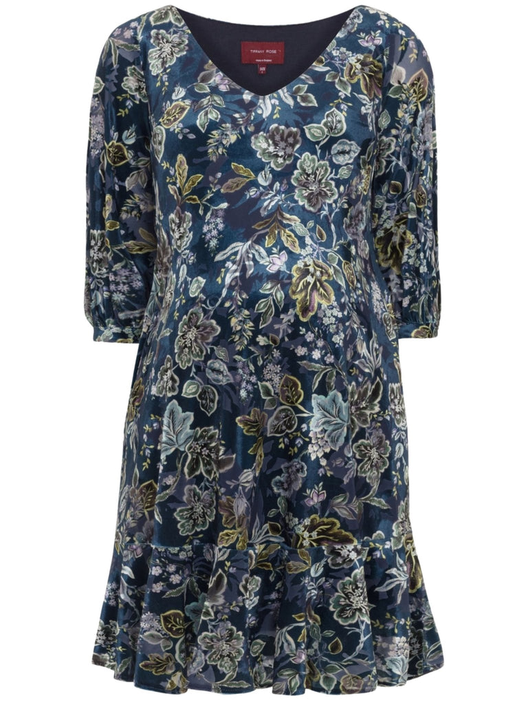 Rich and luxurious to the touch, our enigmatic new velvet fabric is brimming with details. Bright green, purple and blue tones with a hint of shimmer take inspiration from the fashionable 1970s revival. Loose fitting puff bishop sleeves create that chic boho style with a fit and flare skirt for extra swish. A deliciously different dress to wear throughout pregnancy and beyond.