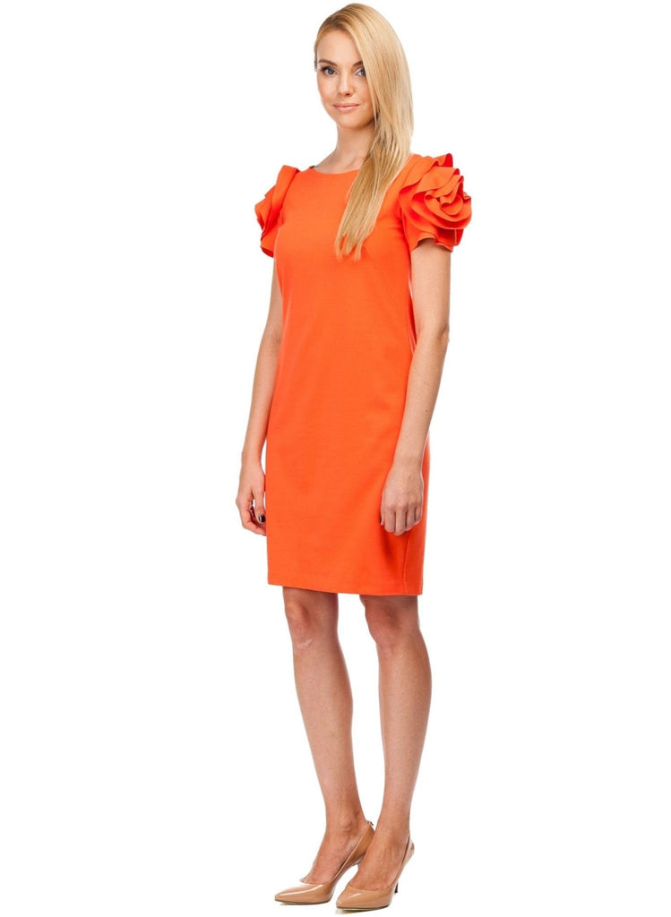 Knee length ponte maternity dress with detailed rose sleeves. Boat neck and zipper detail on back. The stretchy and soft fabric adapts perfectly to the growing