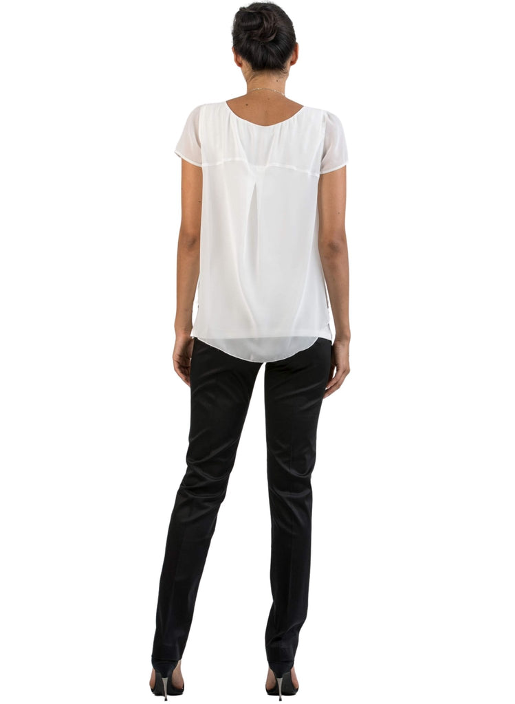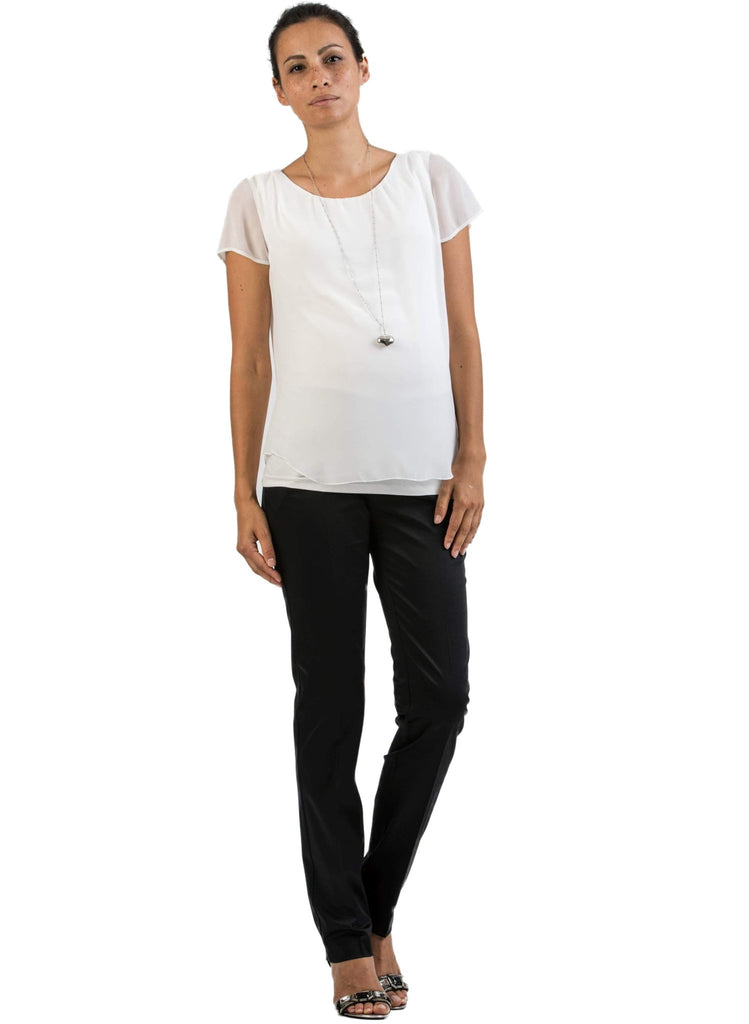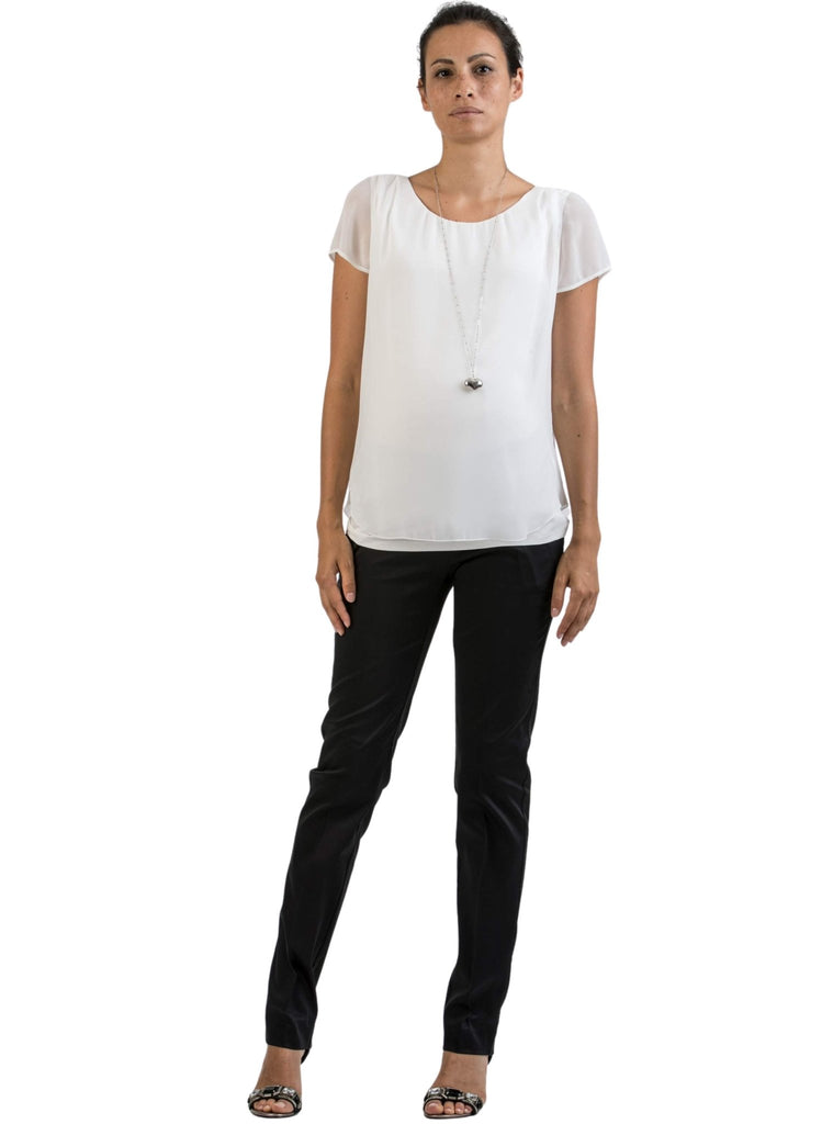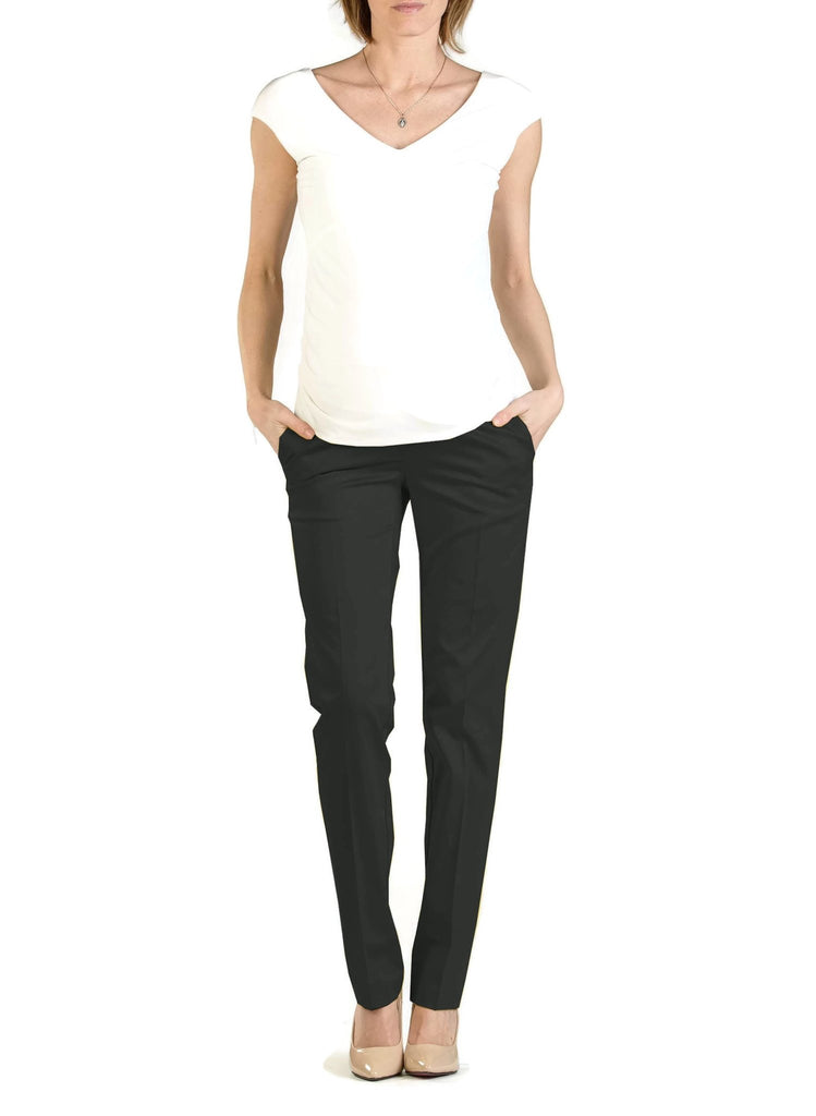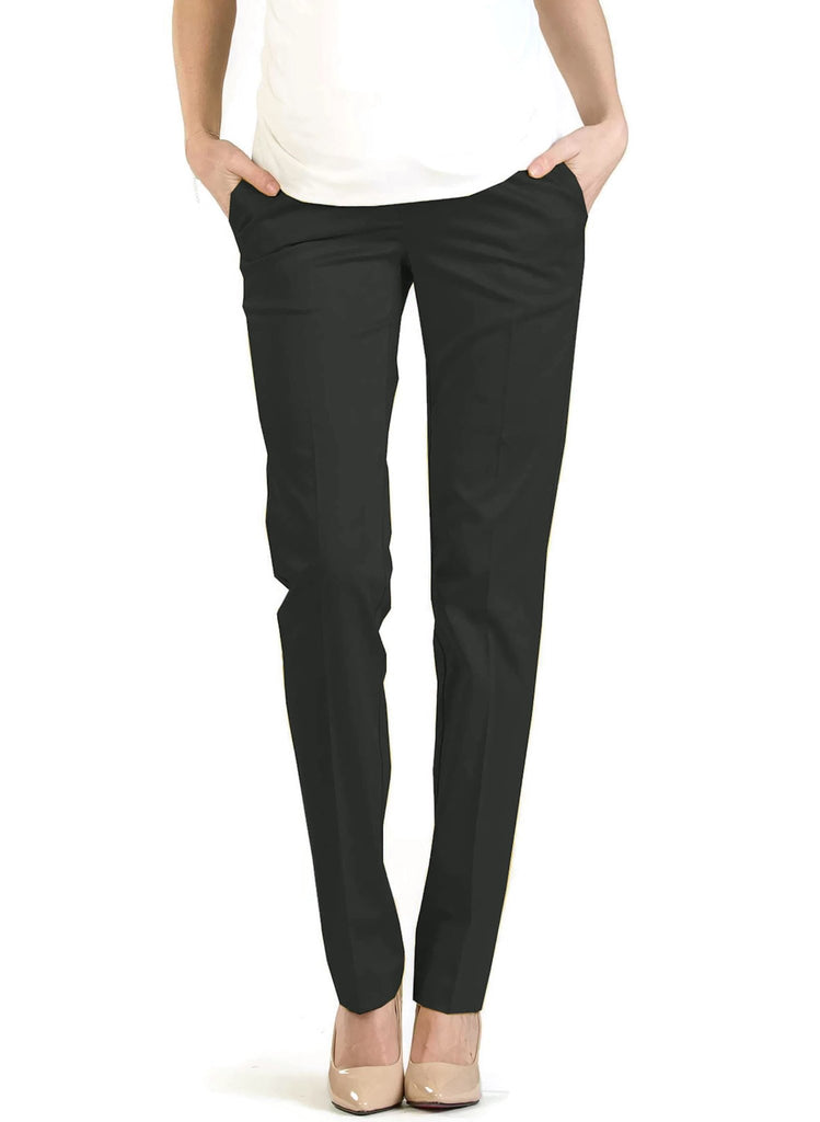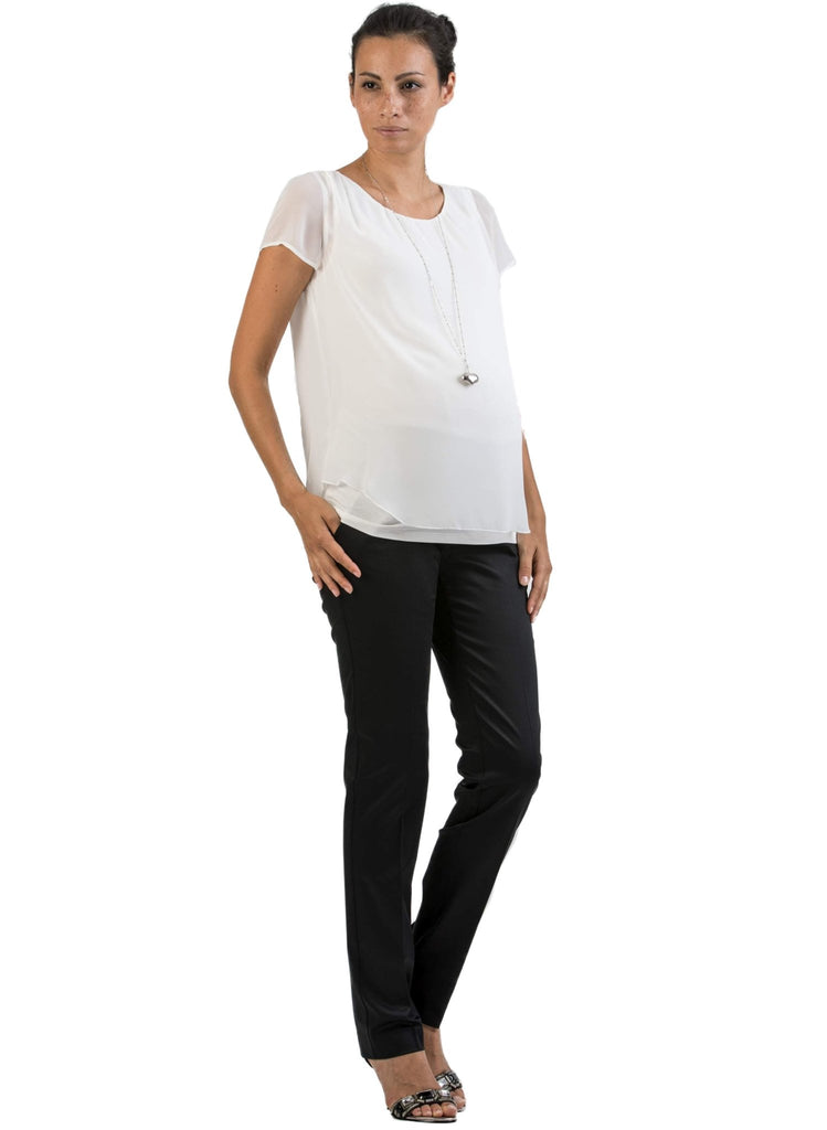 Must-have maternity trousers for office outfit or for any smart occasion. Featuring a straight-leg design, the elegant central crease and the back welt pockets. Made in soft cotton satin, they offer a perfect fit at every stage of pregnancy. The elastic waist donates plenty of room for the entire nine-month period, while the soft cotton jersey band gives the necessary support to the bump. With different accessories, they will result perfect for a night out too.