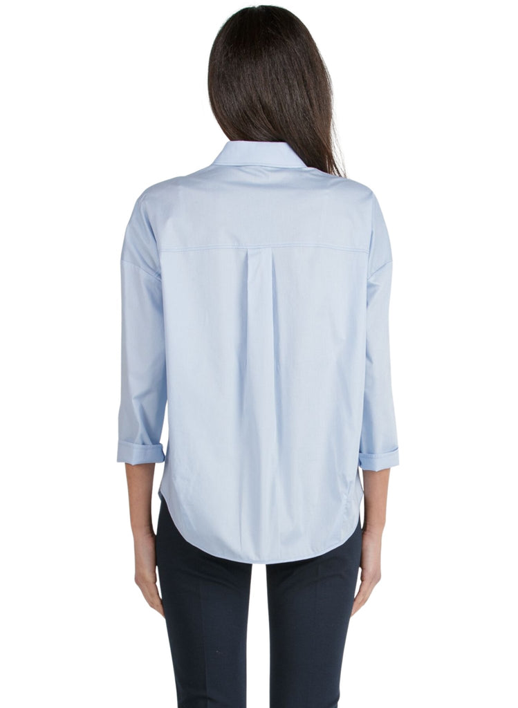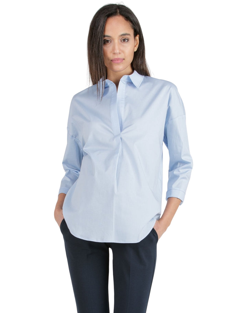 Practical and comfortable oversize maternity shirt in stretch cotton poplin. The shirt collar, the 3/4 sleeve and the round hems contribute to make the shirt refined and casual at the same time and suitable for a sophisticated look or a more casual one. The loose shape fits at every stage of pregnancy and it offers the necessary space for the growing belly.