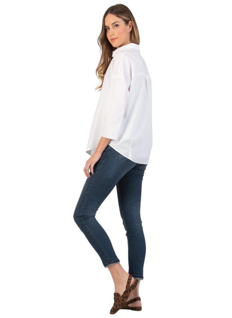 Practical and comfortable oversize maternity shirt in stretch cotton poplin. The shirt collar, the 3/4 sleeve and the round hems contribute to make the shirt refined and casual at the same time and suitable for a sophisticated look or a more casual one. The loose shape fits at every stage of pregnancy and it offers the necessary space for the growing belly.