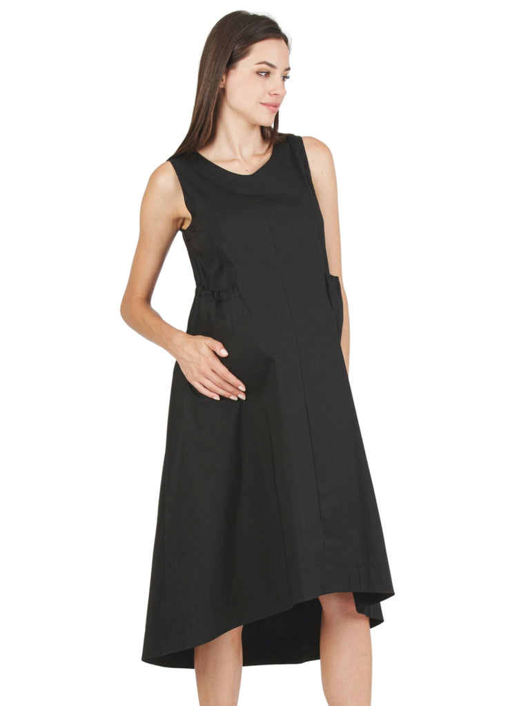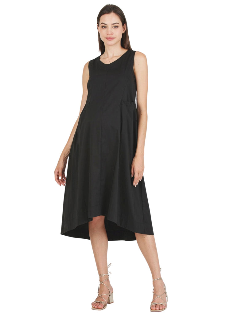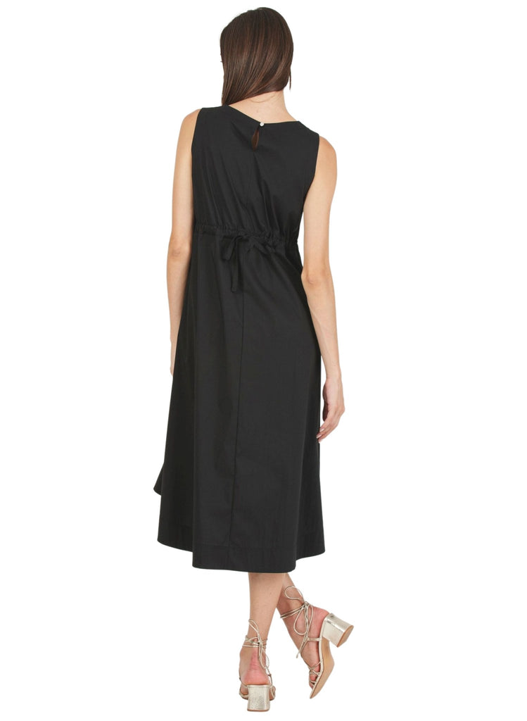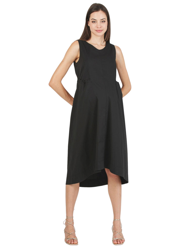 A fresh and refined dress in soft stretch cotton poplin perfect for the whole season. Beautiful details embellish it such as: front curled pockets, adjustable drawstring on the back and midi hem slightly asymmetrical. Wear it in the spring with a fitted top for a really chic pinafore look and then in the middle of summer with a colorful slipper for a practical and comfortable outfit.