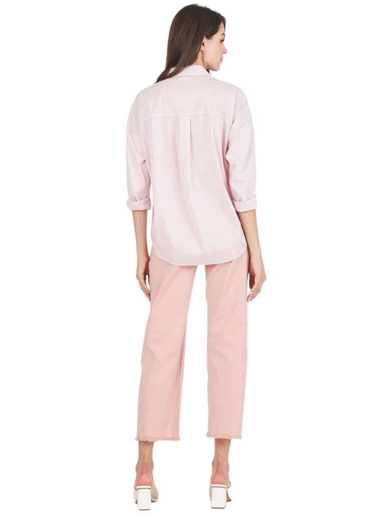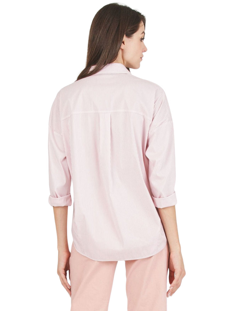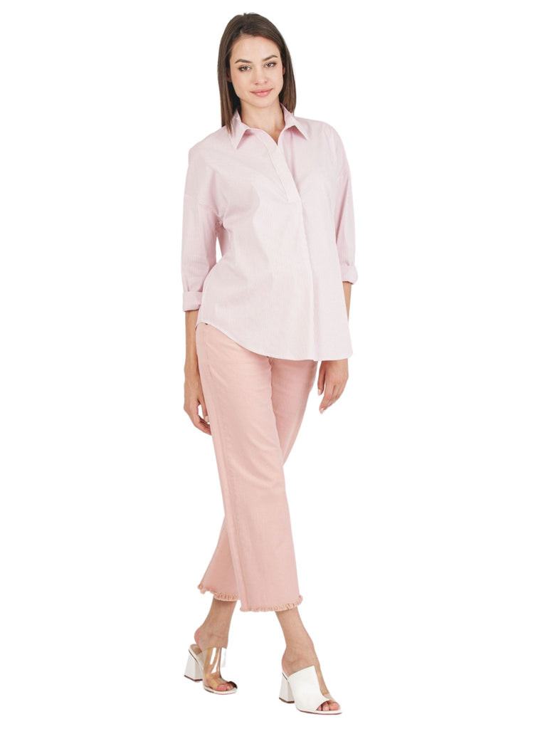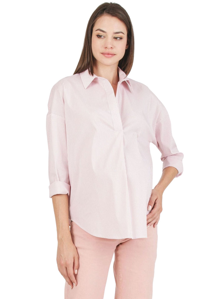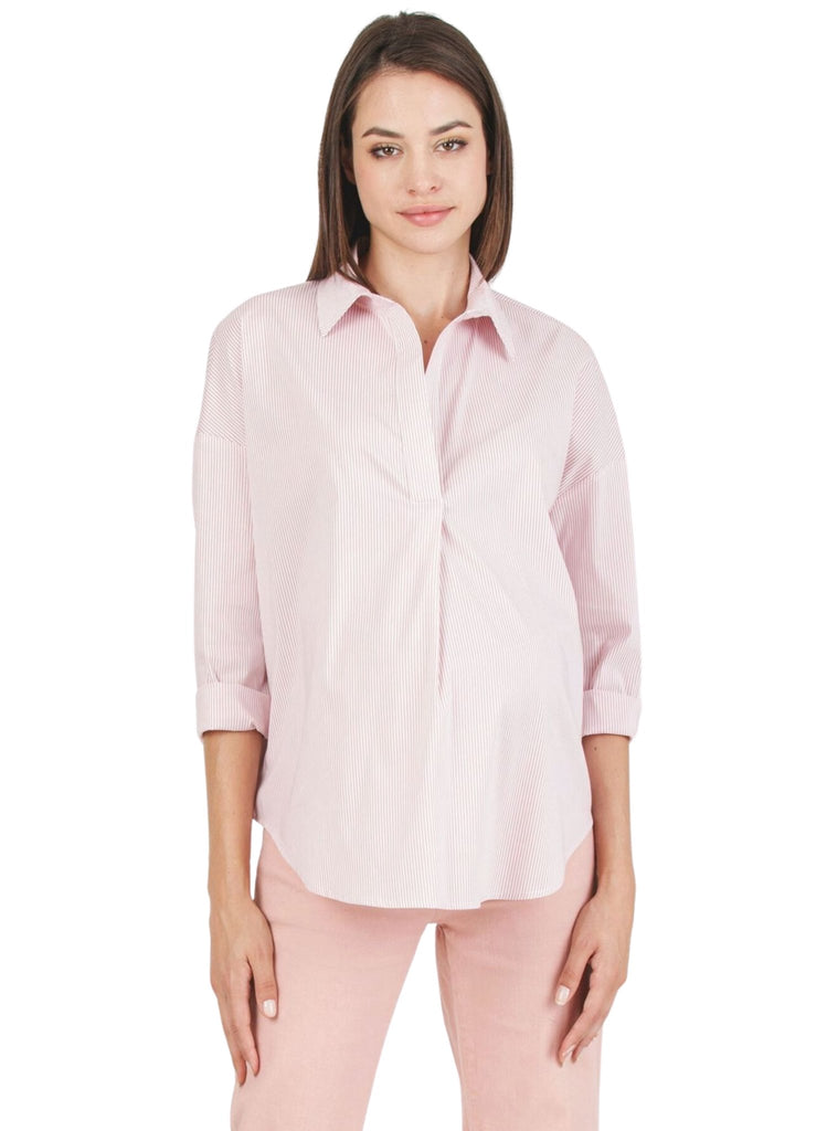 Practical and comfortable oversize maternity shirt in stretch cotton poplin. The shirt collar, the 3/4 sleeve and the round hems contribute to make the shirt refined and casual at the same time and suitable for a sophisticated look or a more casual one. The loose shape fits at every stage of pregnancy and it offers the necessary space for the growing belly.
