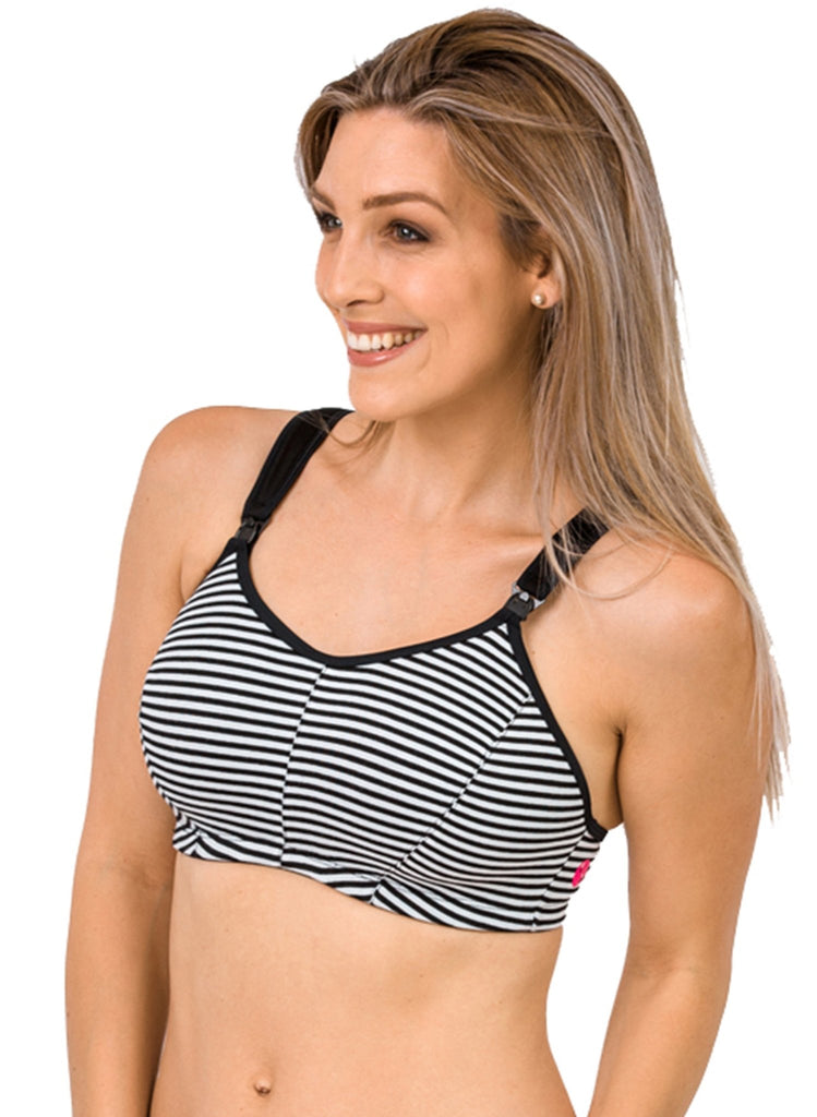 This bra is an absolute game-changer for active breastfeeding mums. Say goodbye to doubling up bras - this incredible high impact nursing sports bra will be your one go-to bra for any type of workout or activity. Built specifically for mums with bigger busts who want to keep exercising, the Ultimate Nursing Sports Bra offers ultimate support and comfort, combined with easy access for breastfeeding. This stylish breastfeeding sports bra comes in two funky colour combos to get you motivated to get out and about with your new baby.
