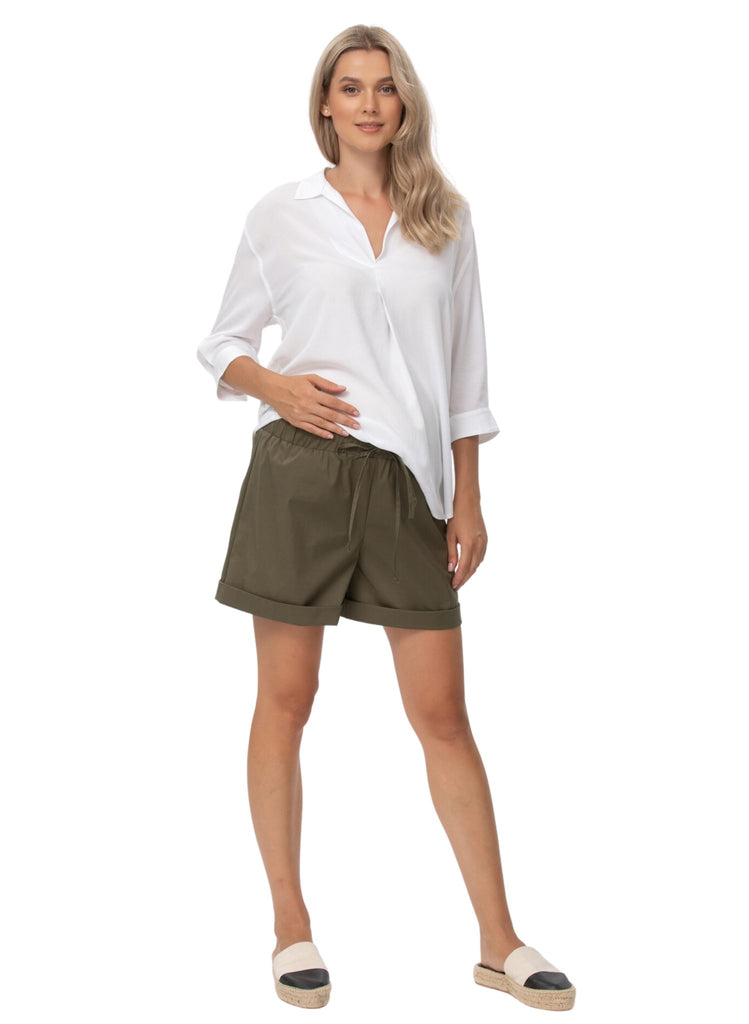 Maternity shorts in cotton The elastic band adapts to all stages of pregnancy. Comfortable and versatile, they are a real must-have for your summer! Length: Short. Perfect before, during and after pregnancy.