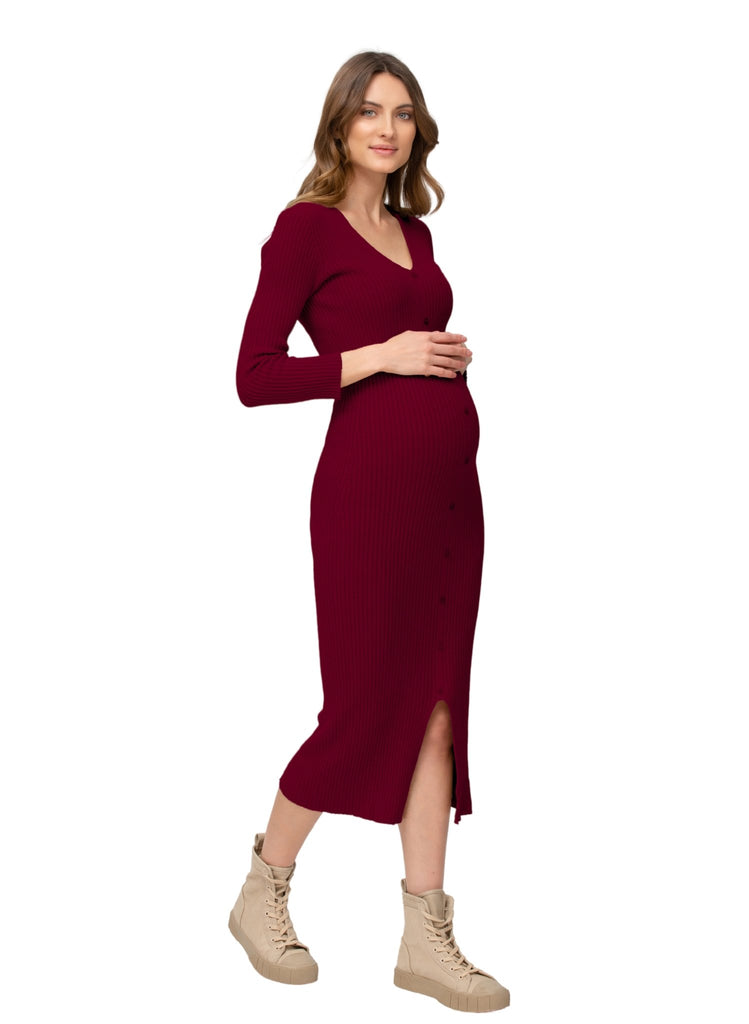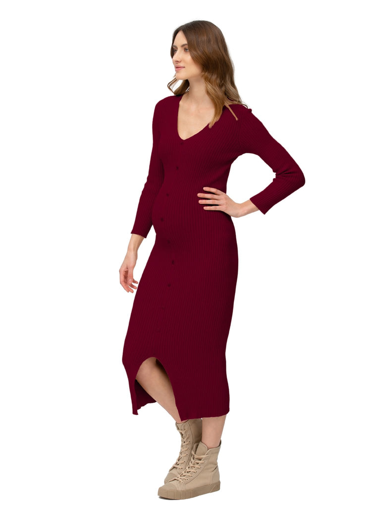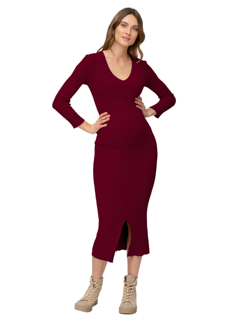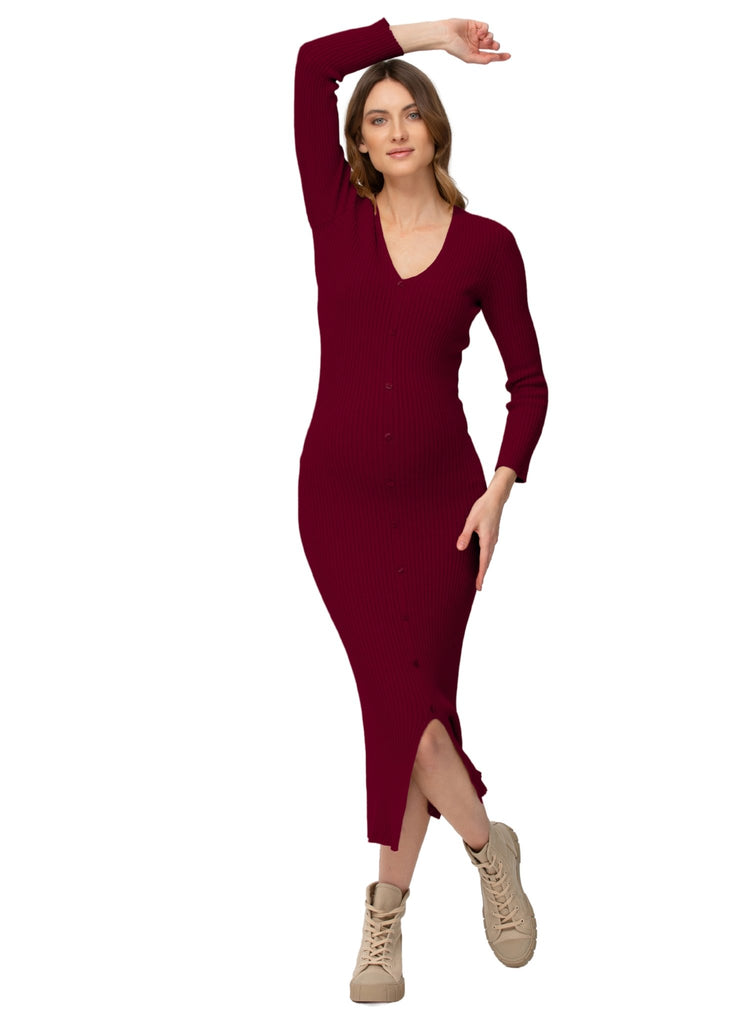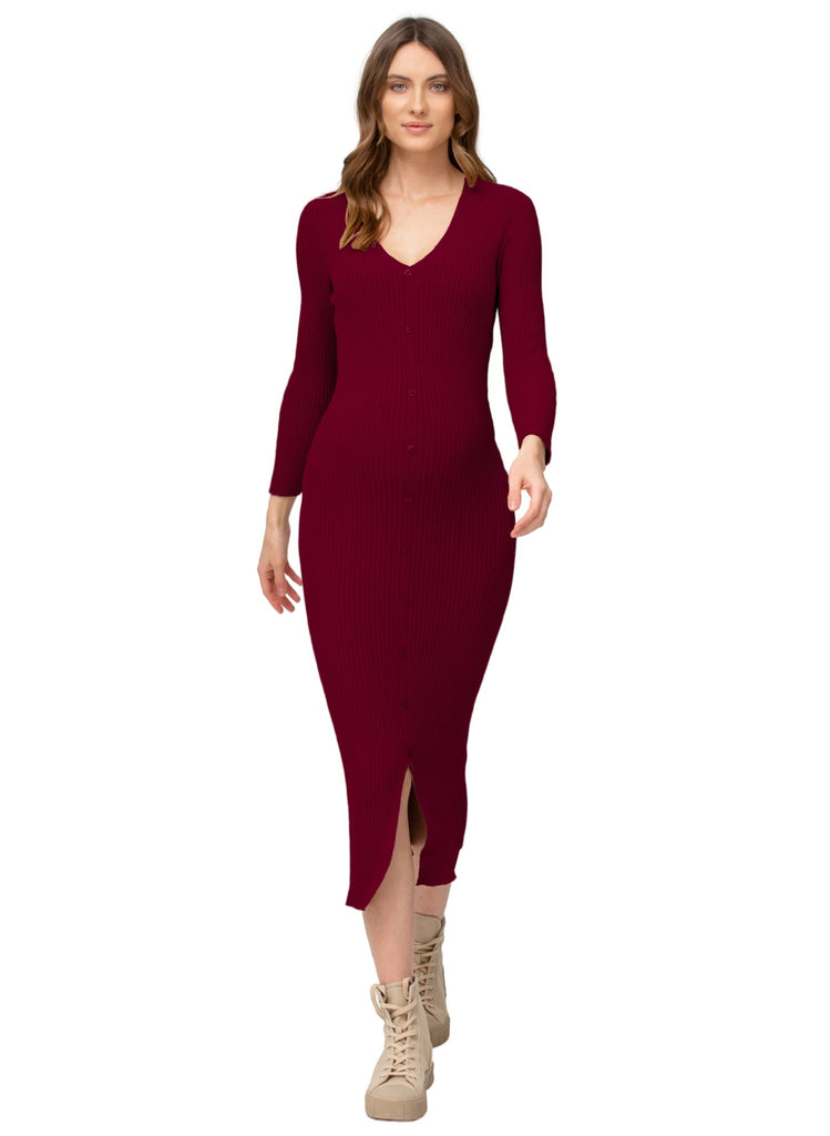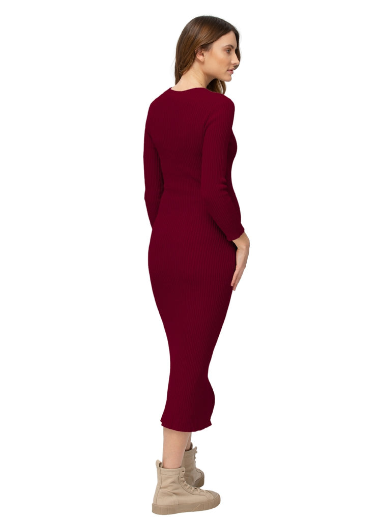 Ribbed bodycon dress with 3/4 sleeves and V-neck. Length below the knee with a central slit. The super stretch ribbed fabric perfectly adapts to your curves and makes it comfortable to wear.