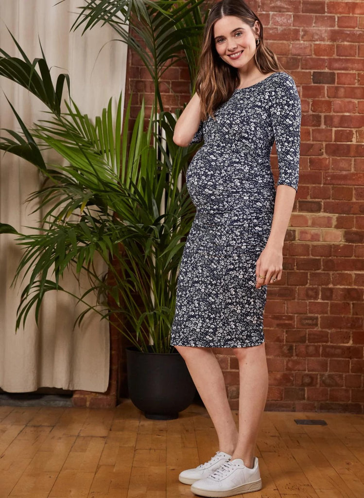 The ‘Hello spring!’ dress. Lyla takes the shape of our best-selling Cassie dress with a soft white floral print on an indigo base for a seasonal twist. We love it with white trainers and a utility jacket for brunch with friends or a walk in the park. Crafted from eco-friendly LENZING™ ECOVERO™ stretch jersey, it’s soft, washes brilliantly and the side seam ruching promises to grow with your bump right through pregnancy.