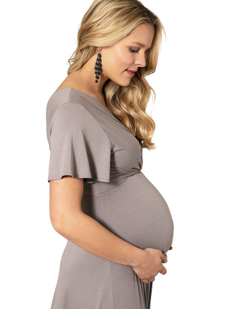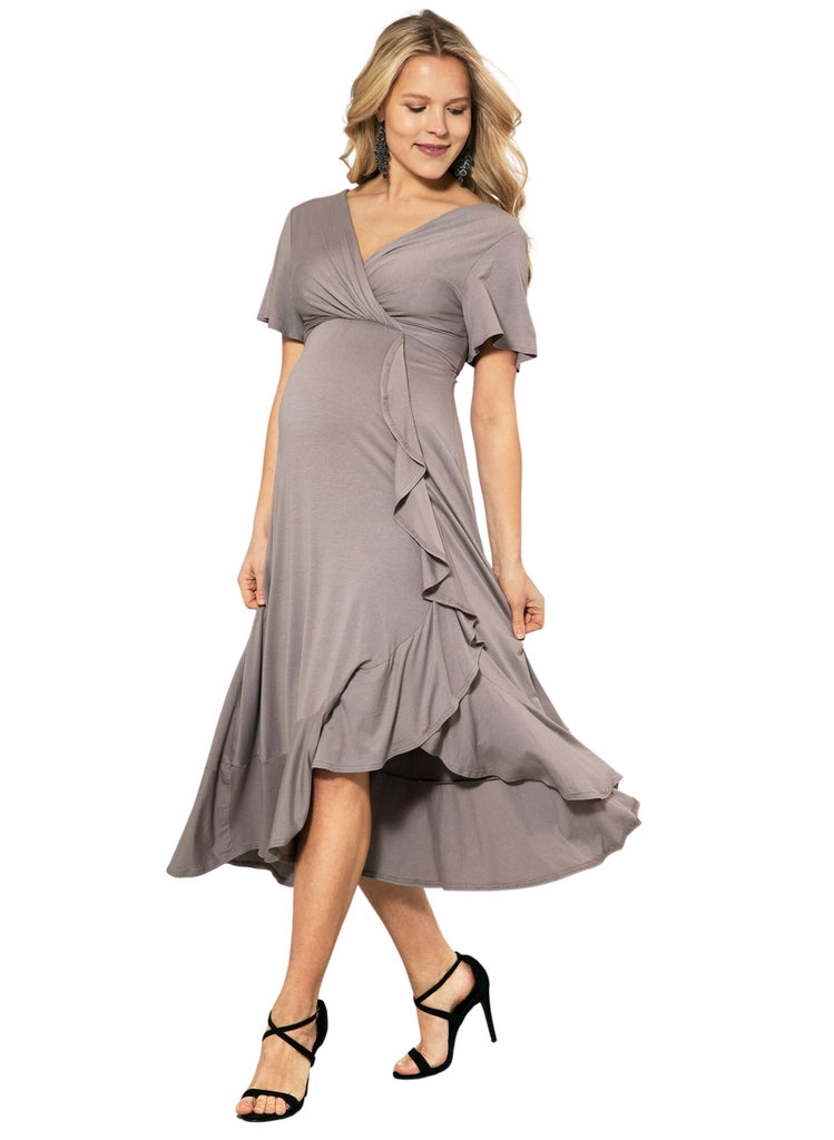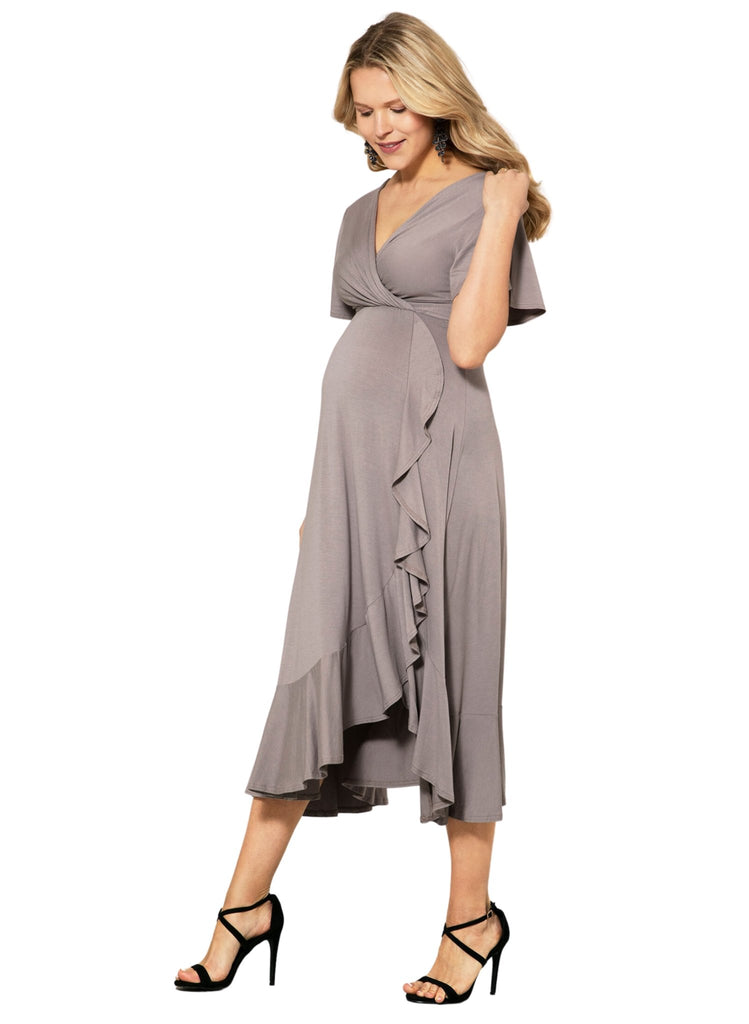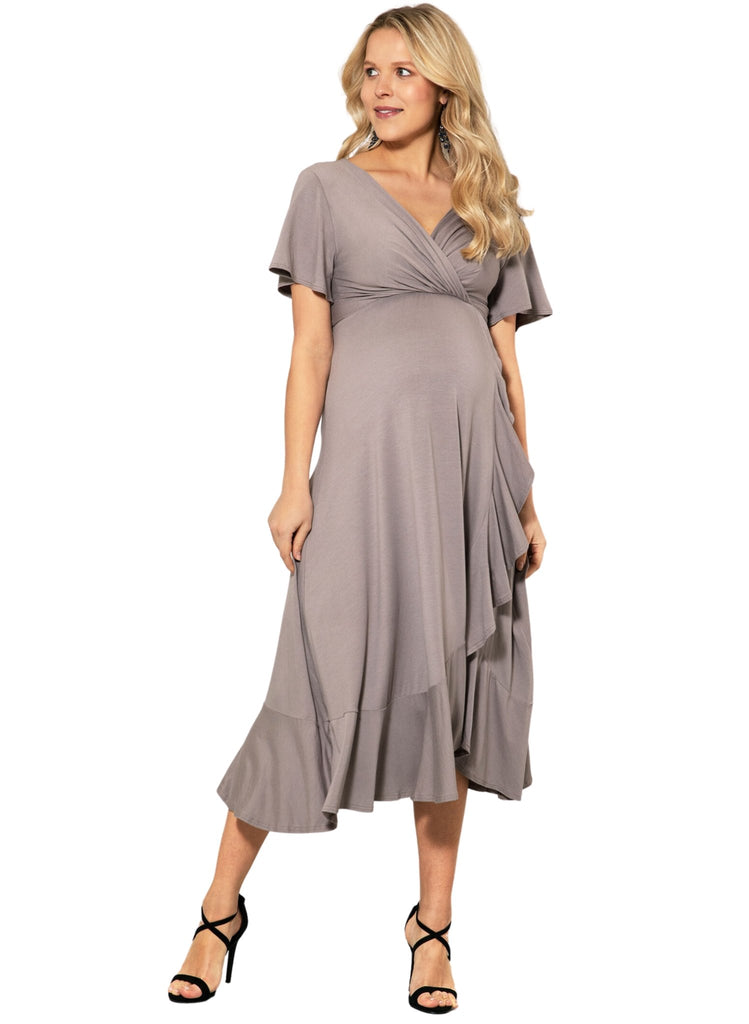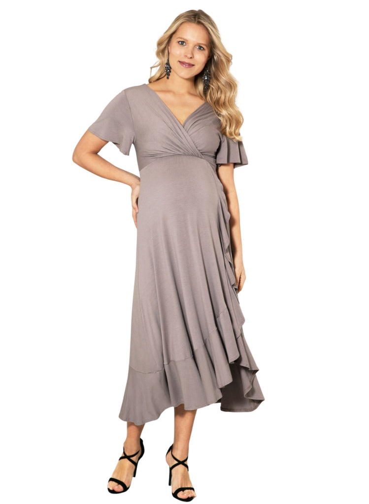 The Waterfall design features ruffle details on the skirt and a gathered cross-over neckline. Perfect for casual or formal styling, this versatile maternity dress is ideal for pregnancy, nursing and afterwards.