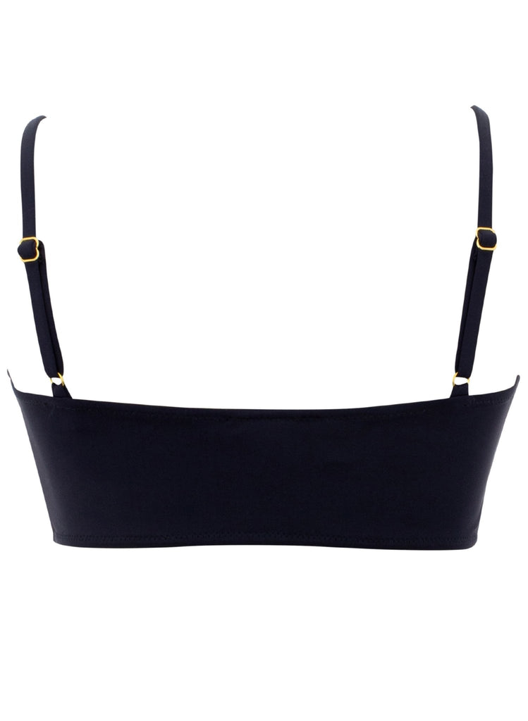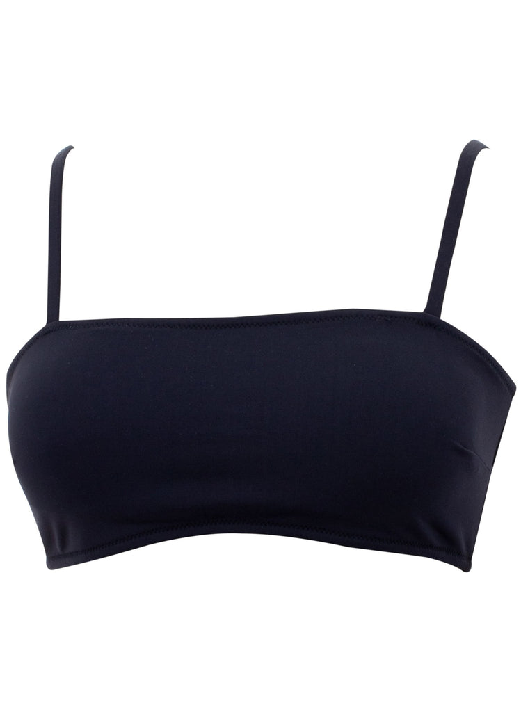 Black bandeau shaped bikini top with shelf lining and removable pads. Straps are adjustable and removable and it has side boning for a comfortable fit. Comes with a Black bikini brief with band on waist that folds over hips for added support. It is fully front lined.