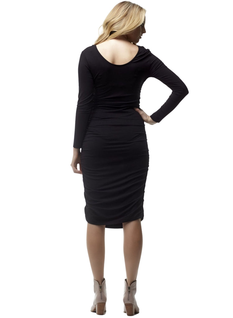 Make a striking statement in this jersey draped dress. Fitted through the body with gathered side seams, scoop neck and long sleeves. This soft jersey fabric will accommodate your glowing belly throughout your pregnancy.