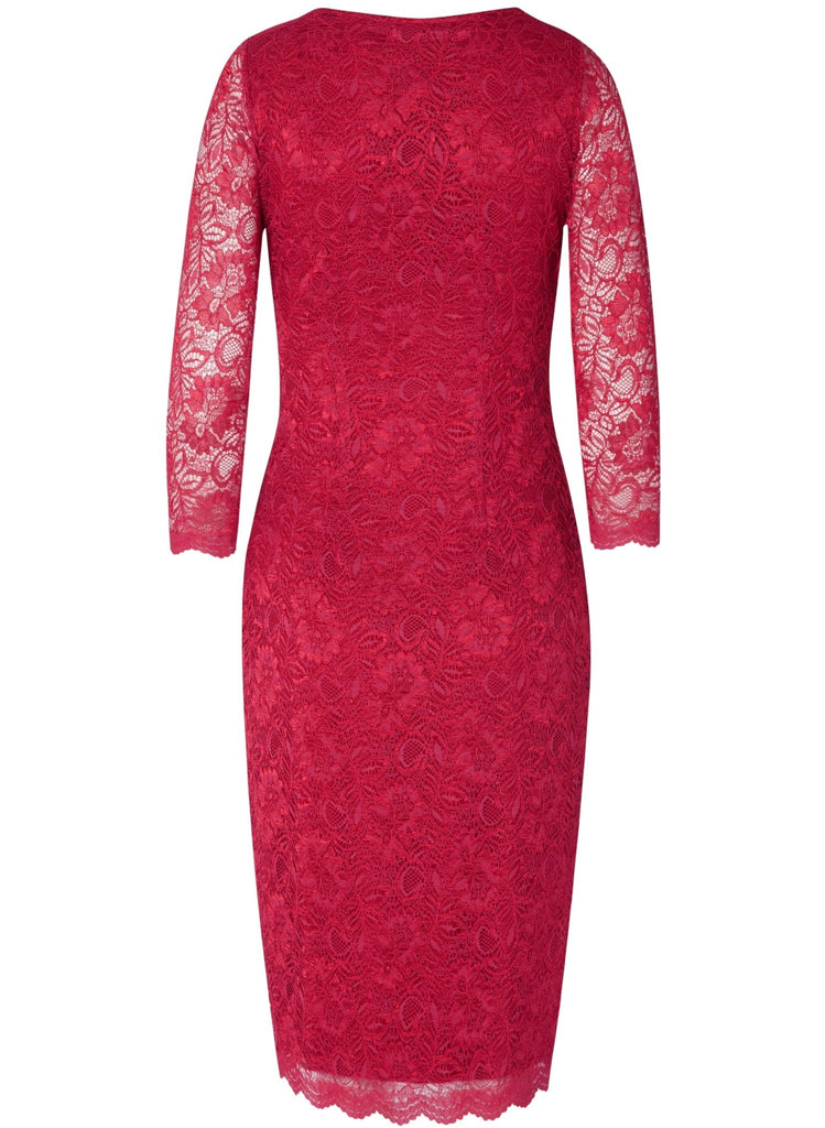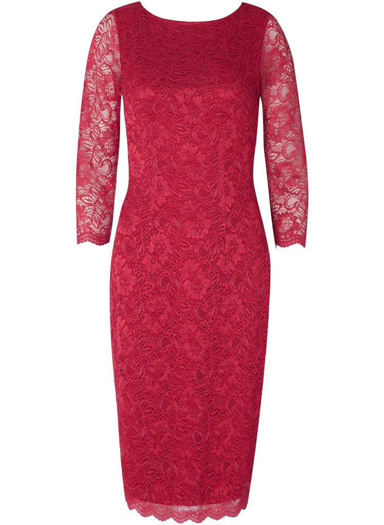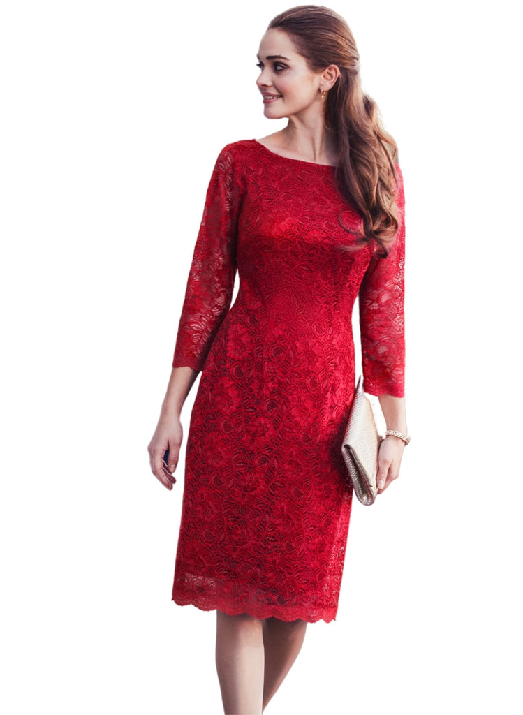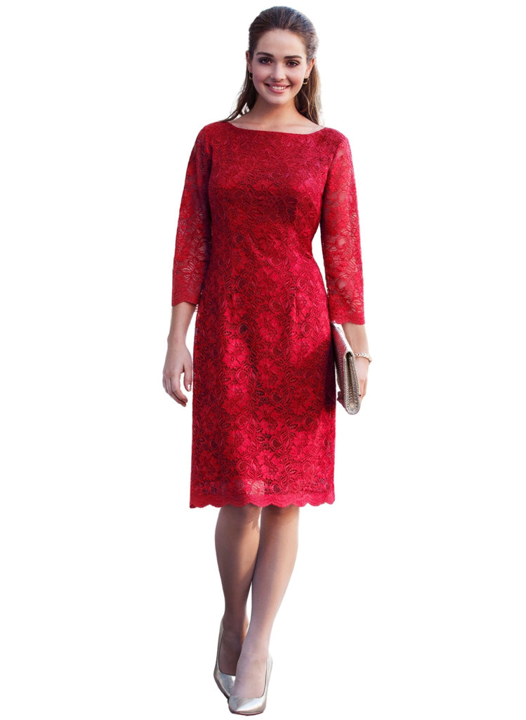 Katherine’s winning formula of elegant corded lace and classic high neckline make our beautiful lace dress a star. Now in sensuous scarlet red with a discreet side closure for a smooth fit over hips.