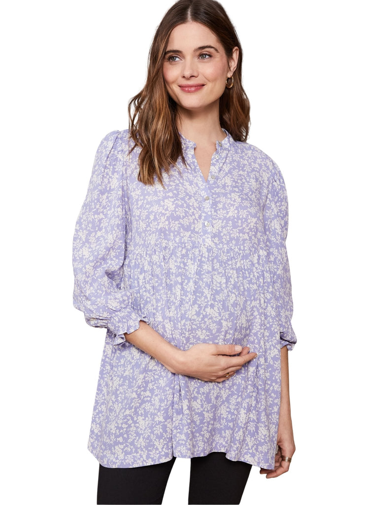 Floaty, feminine and floral - this blouse will make your outfit sing! All you need to elevate your maternity jeans and leggings, its buttons fasten down to an empire line seam where the fabric skims the bump for a flattering, longline silhouette. Topped with pretty smocked cuffs and a stand collar, it’s one of our new favourites.