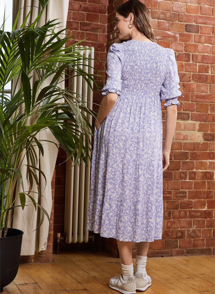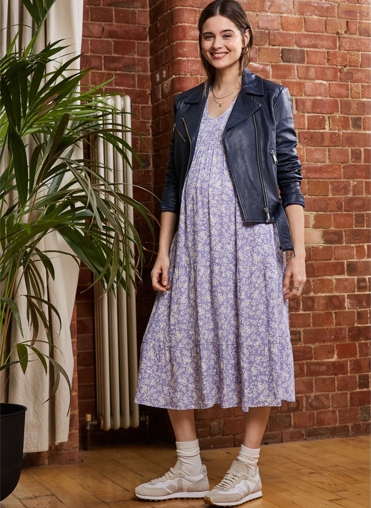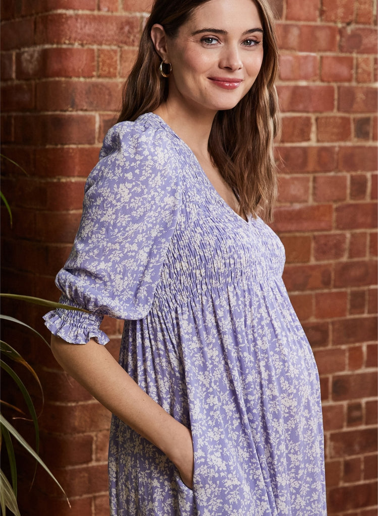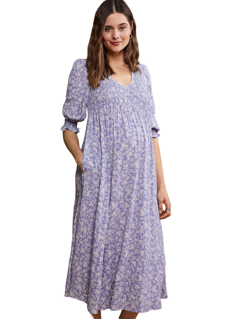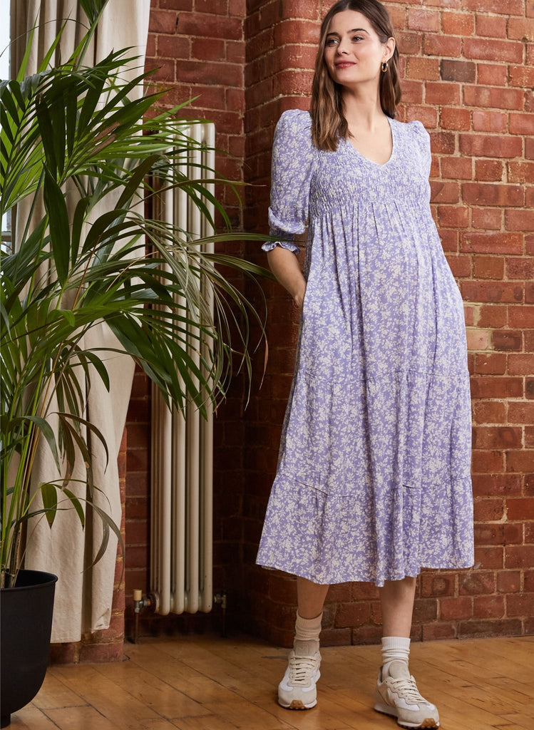 Marlene is our trend-inspired answer to feeling cool and comfortable during pregnancy. Not only does it come in a pretty lavender floral print, it features a smocked bust designed to grow as you do, which then flares out over the bump into a tiered midi skirt. The sleeves are a talking point too: note the smocked, frilly cuffs. Wear it for your baby shower and to leisurely lunches and feel a million dollars!