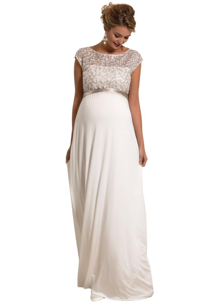 A silver sequin encrusted bodice is beautifully designed with a soft jersey floor length maternity gown for after dark glamour.