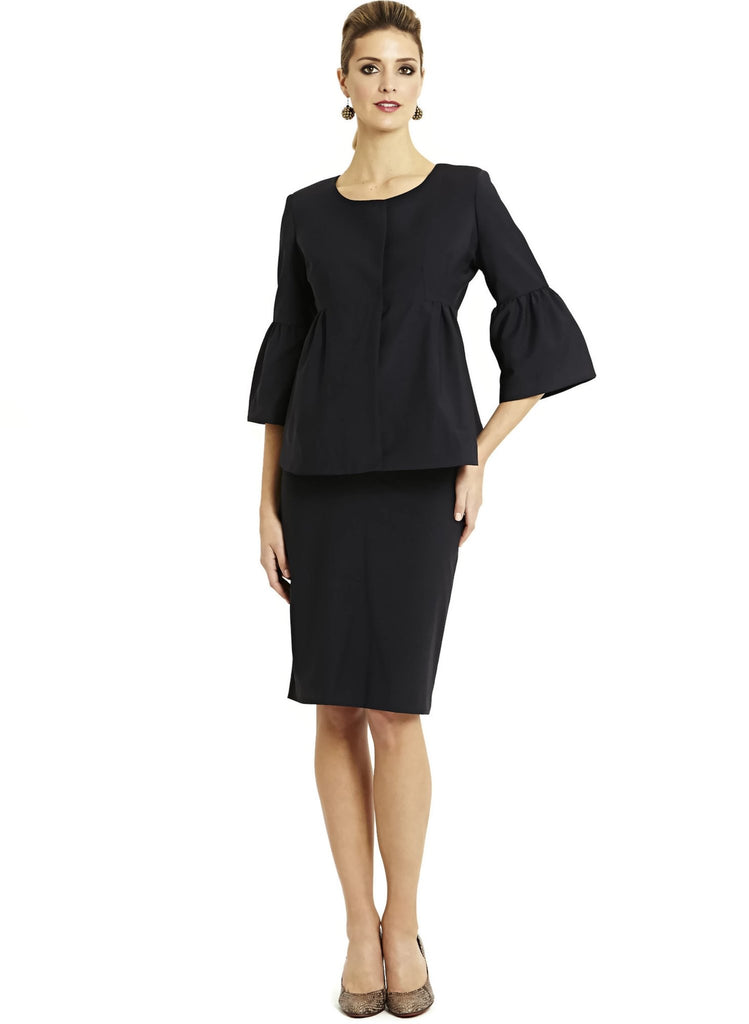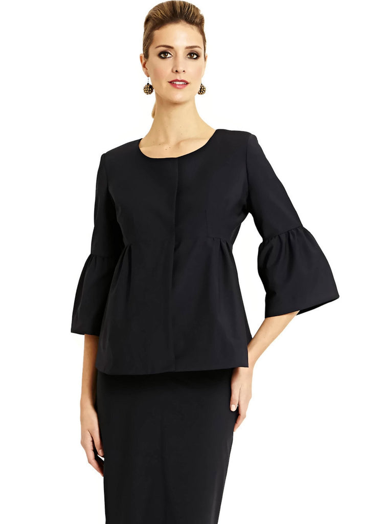 The Oslo is a stylish jacket with 3/4 ruffled sleeves that will turn any look into an elegant and chic outfit. Wear it over a simple shirt and with a pair of slacks for a refreshing office look or with a skirt to a party.