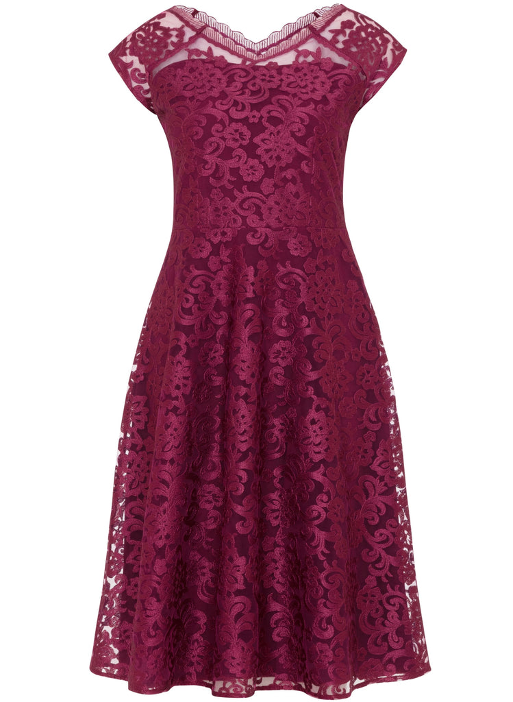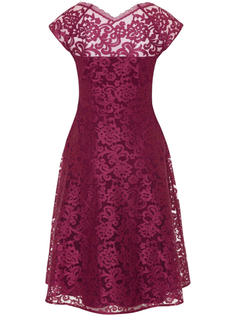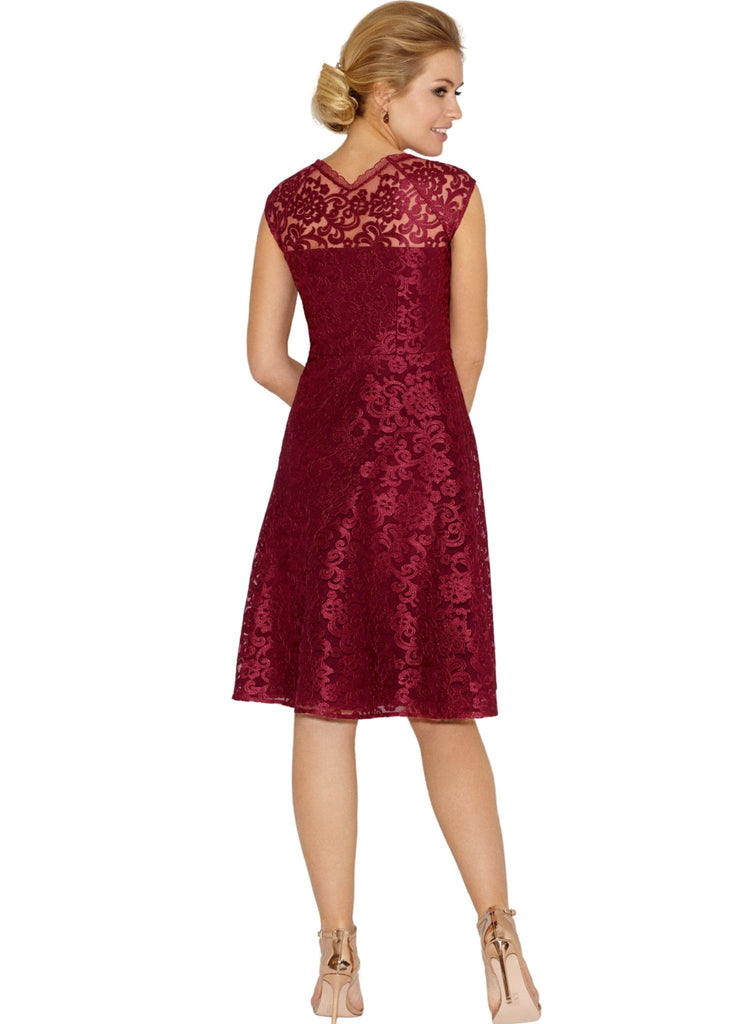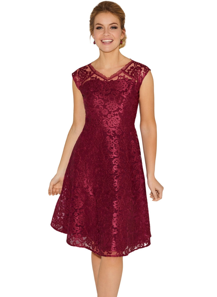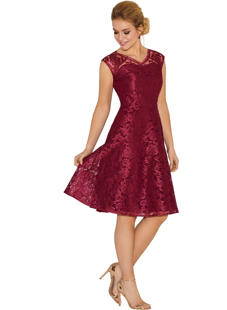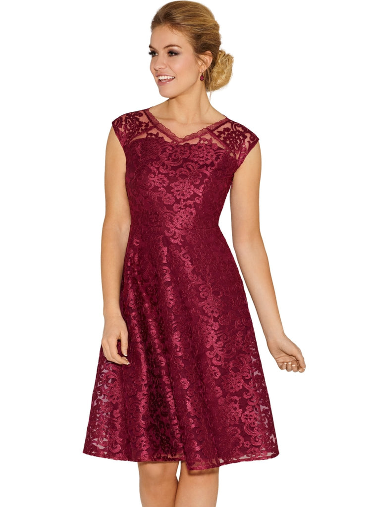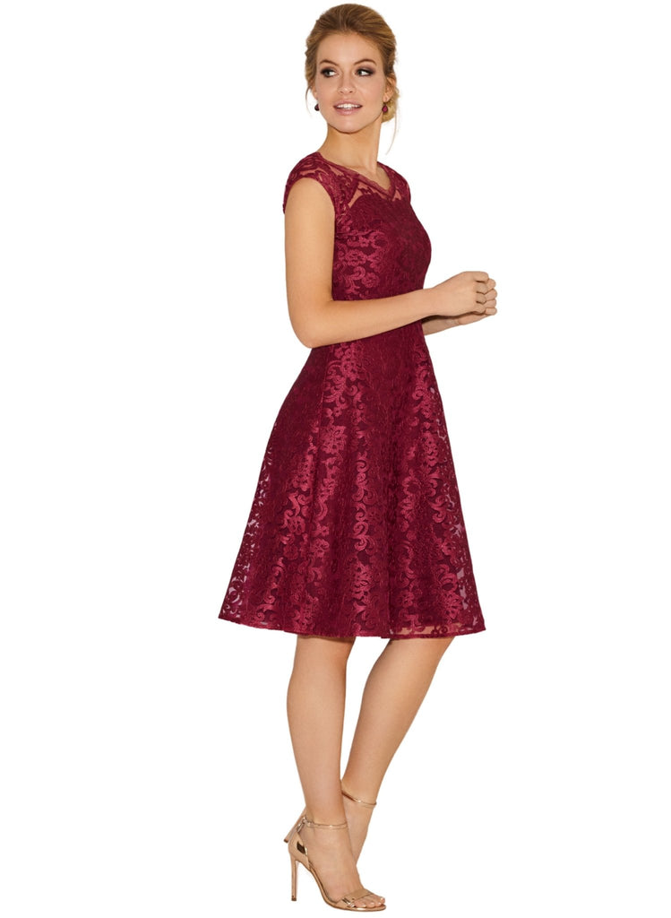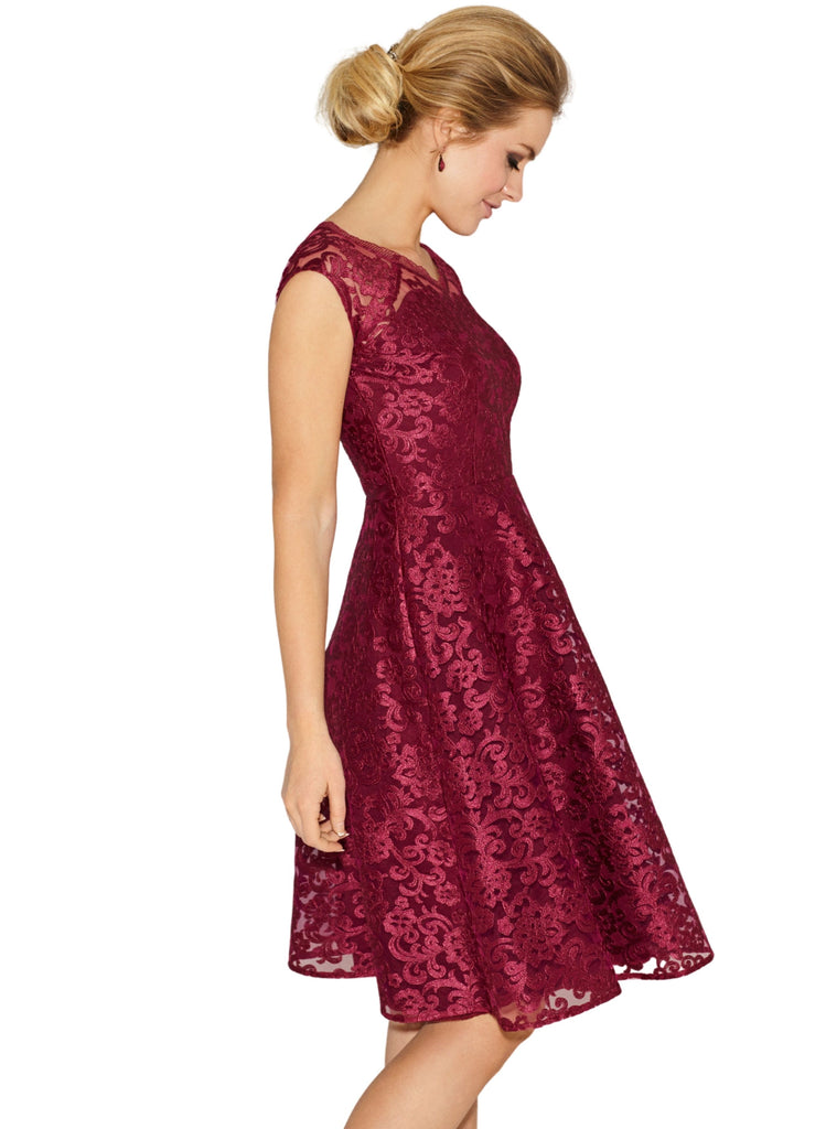 Rich and opulent in regal Scarlet, our sensuous lace dress is made from a structured floral embroidered tulle fabric, perfect for a romantic dinner or special occasion.When you need a dress to ensure you shine, our Paris short lace dress delivers with a striking v neckline mirrored front and back and a full, feminine skirt.